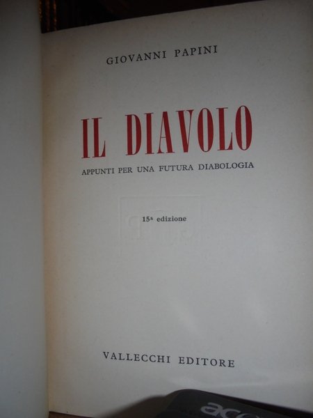 (Occultismo) Papini, Giovanni. Firenze, Vallecchi Editore, 1954. Il Diavolo. Appunti per una futura diabologia. In-16°, cartoncino edit. ill. 394, (4) pp. con 8 tavole f.t. Ottimamente conservato. Neg. esot. mob. 101