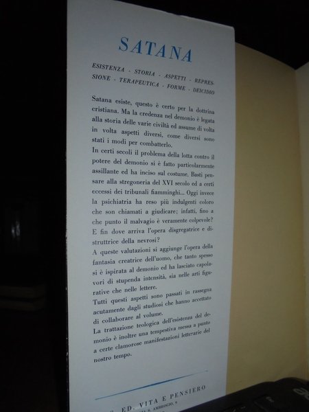AA.VV. Milano, Società Editrice " Vita e Pensiero", 1954. SATANA. Prima edizione. In-8°, cart. edit. con sovracopertina. 454 pp. con alcune tavole in bianco e nero fuori testo. Ottimo esemplare. Neg. esot. mob. 51