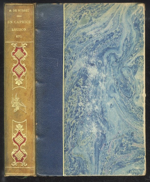 Paris, Librairie Alphonse Lemerre, [fine del XIX secolo - primi del XX secolo], in-16, elegante legatura coeva in mezzo marocchino blu, dorso con titolo e fregi in stile neorococò impressi in oro con particolari mosaicati in pelle rossa e figurina di Cupido in oro, taglio superiore dorato, conservate all'interno le copertine della brossura editoriale, pp. [4], 411, [3]. Con 6 tavole incise all'acquaforte su disegni di H. Pille da L. Monziès. Il colore della pelle al dorso ha virato verso una tonalità verde per esposizione alla luce, per il resto ottime condizioni.