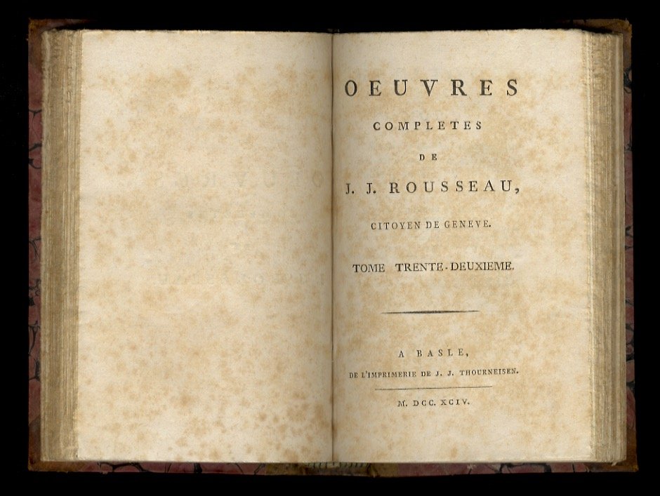 A Basle, de l'Imprimerie de J.J. Thourneisen, 1793-1794, volumi 2 legati in uno, in-12, legatura di poco successiva in mezza pelle, titolo e numero di volumi in oro su doppio tassello in pelle verde oliva al dorso, piatti in carta marmorizzata, pp. [4], 321, [1] - [4], 384. Fra i testi contenuti: "Exposé succint del contestation qui s'est élevée entre M. Hume et M. Rousseau, avec Pieces justifucatives", "Justification del J.J. Rousseau dans la contestation qui lui est survenue avec M. Hume", "L'homme moral opposé a l'homme physique".