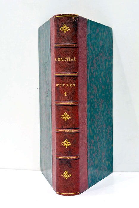 Tome I seul. 387 pages. 4 feuillets. Mémoires XL. (18x11,5cm). Demi-cuir. Dos à nerfs ornée avec auteur et tomaison en lettres dorées. Couverture avec petites rayres sans gravité. Dos et coins un peu frottés, sinon bien relié. Publiée à Paris en 1864, cette édition des œuvres complètes de Martial, célèbre poète latin du Ier siècle, offre aux lecteurs francophones une immersion dans l'art de l'épigramme, genre littéraire où Martial excella. La traduction par Verger, Dubois et Mangeart vise à rendre accessible la finesse et l'esprit de ses courts poèmes, souvent empreints d'humour et de critique sociale. L'introduction par Jules Janin, écrivain et critique littéraire reconnu du XIXe siècle, fournit un éclairage sur la vie de Martial et son importance dans la littérature antique. Papier légèrement bruni avec taches et légères rousseurs sans gravité. Bon exemplaire. Tome I seul.