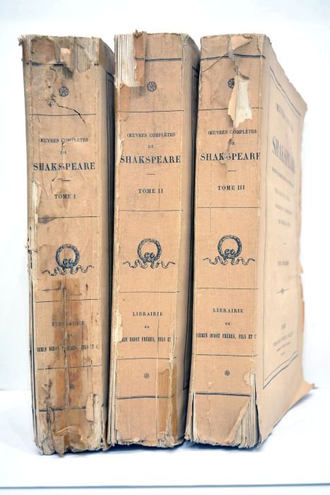 3 volumes. Tomes 1, 2 et 3. LVII. 631 pages. + 677 pages. + 640 pages. (27x19cm). Broché. Non rogné. Couverture papier imprimée de l'éditeur. Couverture usagée. Quelques taches et salissures. Dos fendillé et déchiré. Accidents aux coiffes. Intérieur satisfaisant. Exemplaire particulièrement frais dans une couverture éditeur qui mérite une restauration. Premier tome: Remarques sur la vie et les ouvrages de Shakspeare, Othello, La Tempête, Jules César, Roméo et Juliette, Coriolan, Richard II, Macbeth, Le roi lear, Comme vous l'aimez, Titus andronicus, Le songe d'une nuit au milieu de l'été, Timon d'Athènes, Le Marchand de Venise. Second tome: Antoine et Cléopatre, Beaucoup de bruit pour rien, Hamlet, La vie et la Mort du roi Jean, Henri IV, Richard III, Henri VIII, Henri V, Henri VI, Troisième tome: Peines d'amour perdues, La douzième nuit, Tout est bien qui finit bien, Les méprises, Les deux gentilshommes de Vérone, La méchante femme mise à la raison, Troile et Cresside, Cymbeline, Les joyeuses commères de Windsor, Mesure pour mesure, Le Conte d'Hiver, Périclès, Vénus et Adonis, La mort de Lucrèce.