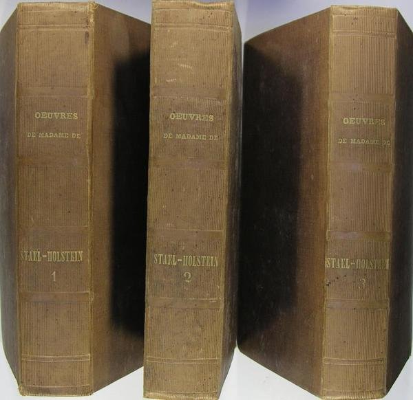 A Paris, chez Lefèvre libraire, 1858. 3 volumes in/8 reliure toile havane, dos lisses à titres dorés, tranches latérales non massicotées, 882 pages 857 p. & 755 pages. Quelques taches claires sur les plats de deux volumes. Anne-Louise Germaine Necker, baronne de Staël-Holstein, connue sous le nom de Madame de Staël, (1766 - 1817), romancière et essayiste française d'origine genevoise. Germaine était la fille du banquier Jacques Necker (plus tard ministre des finances du roi de France Louis XVI). Les ouvrages présents réunissent les titres : "Sur les écrits de Rousseau", "Sur le caractère de Rousseau", "Mirza", "Adélaïde et Théodore", "De Pauline", "Des passions", "De la littérature", "Corinne ou l'Italie", "De l'Allemagne", "De la majorité de la nation", "Du caractère de M. Necker et de sa vie privée".