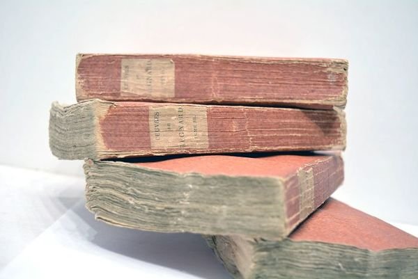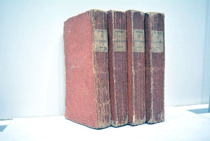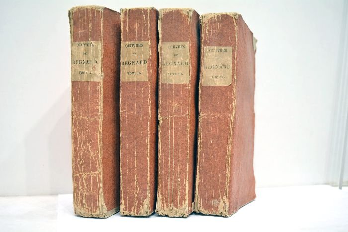 4 volumes in-12. XXVII. 355 pages + 353 pages + 374 pages + 440 pages. (18x11cm). Broché. Couverture de papier à la colle. Etiquette au dos. Reliure de l'époque. Non rogné. Traces de plis. Usures aux dos. Agréable exemplaire de cette édition des oeuvres de Jean-François Regnard, contenant son théâtre et ses récits de voyages en Normandie, Flandres et Hollande, Laponie, Suède, Pologne et Allemagne. Exemplaire frais et non rogné.