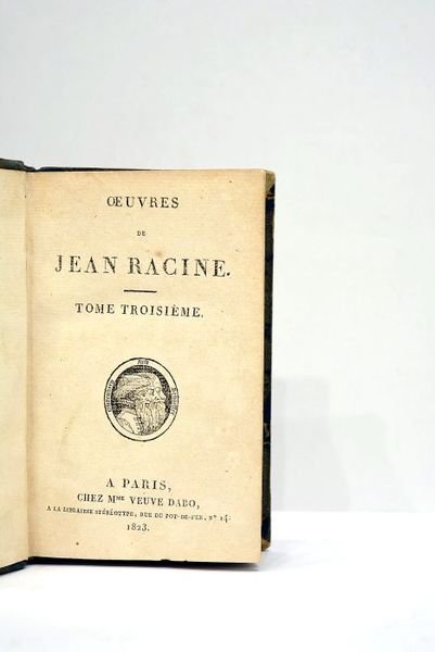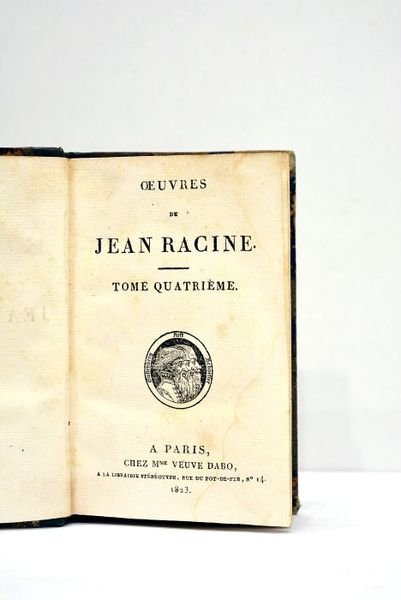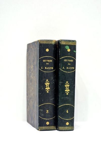 2 volumes. Tomes 3 et 4 seuls. 404 pages. + 396 pages. (13,5x8,5cm). Demi-basane. Dos lisse titré avec des lettres dorées. Coiffes légèrement élimées. Quelques frottements. Coins un peu émoussés. Quelques rousseurs. Traces de mouillure touchant une soixante-dizaine de pages au tome troisième. Froissures importantes sur les pages du tome cinquième. Bon état par ailleurs. Tome 3 contenant: Iphigénie, Phèdre, Esther, Athalie, le plan du premier acte d'Iphigénie en Tauride et Poésies diverses. Tome 4 contenant: Lettres sur les imaginaires, Abregé de l'Histoire de Port-Royal, Discours académiques, Extrait du traité de Lucien intitulé: Comment il faut écrire l'histoire, et des ouvrages diverses attribués à Racine.