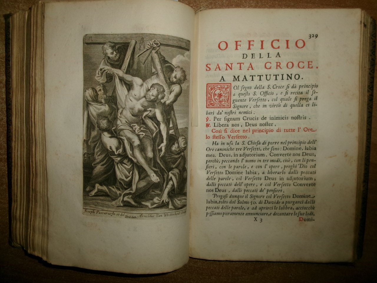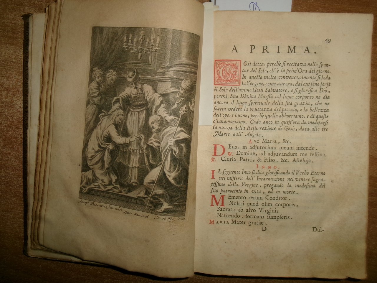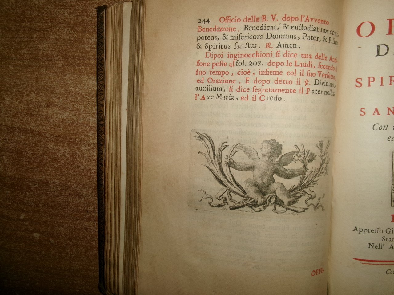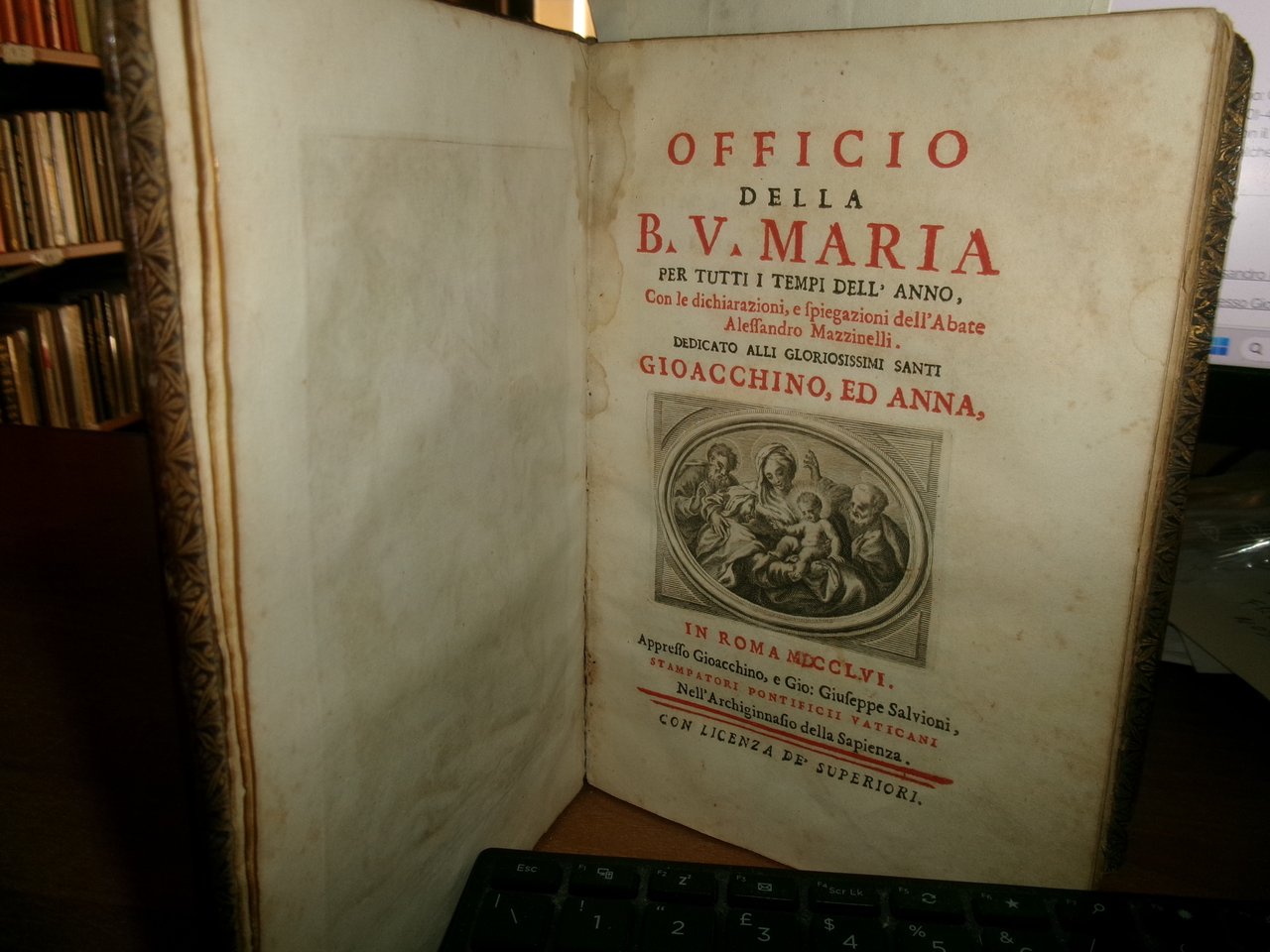 Officio della B. V. Maria per tutti i tempi dell' anno, Con le dichiarazioni, e spiegazioni dell' Abate Alessandro Mazzinelli. Dedicato alli Gloriosissimi Santi GIOACCHINO, ed ANNA. Roma: Gioacchino e Giovanni Giuseppe Salvioni, Stampatori Pontificii Vaticani, 1756. In-8° , splendita legatura in piena pelle coeva, dorso a nervetti, ricchi fregi in oro sui piani e al dorso. [24], 407, [1] pp. 2 parti, l'Ufficio dei Morti con titolo separato. Stampato in rosso e nero. Frontespizio inciso e 15 incisioni in rame a piena pagina di Arnold Van Weserhout e Jacob Frey secondo Joseph Passarus (Giuseppe Passaro), due vignette incise del titolo e 12 vignette della cordiera, alcune non firmate, altre di Frey secondo Passaro o di M. Schedi (incisore), 3 iniziali incise, numerose iniziali xilografiche stampate in rosso. Testo in italiano e latino. Bell' esemplare nonostante un lieve alone di umidità nel margine vicino al dorso delle prime pagine ed alcune macchioline in poche pagine. Neg. Mens. Bianca cassa entro busta trasp.
