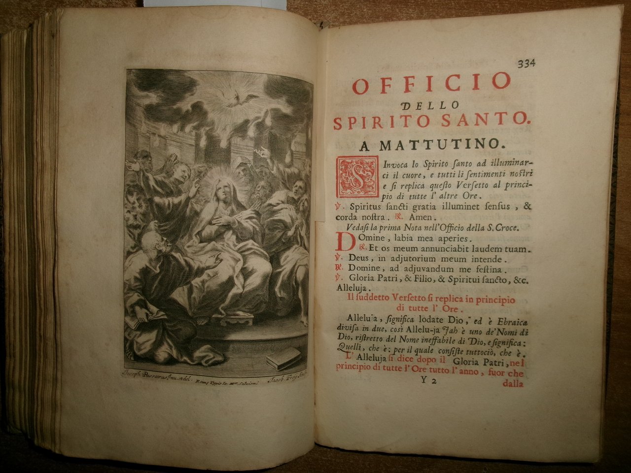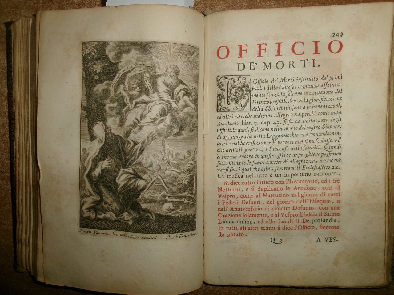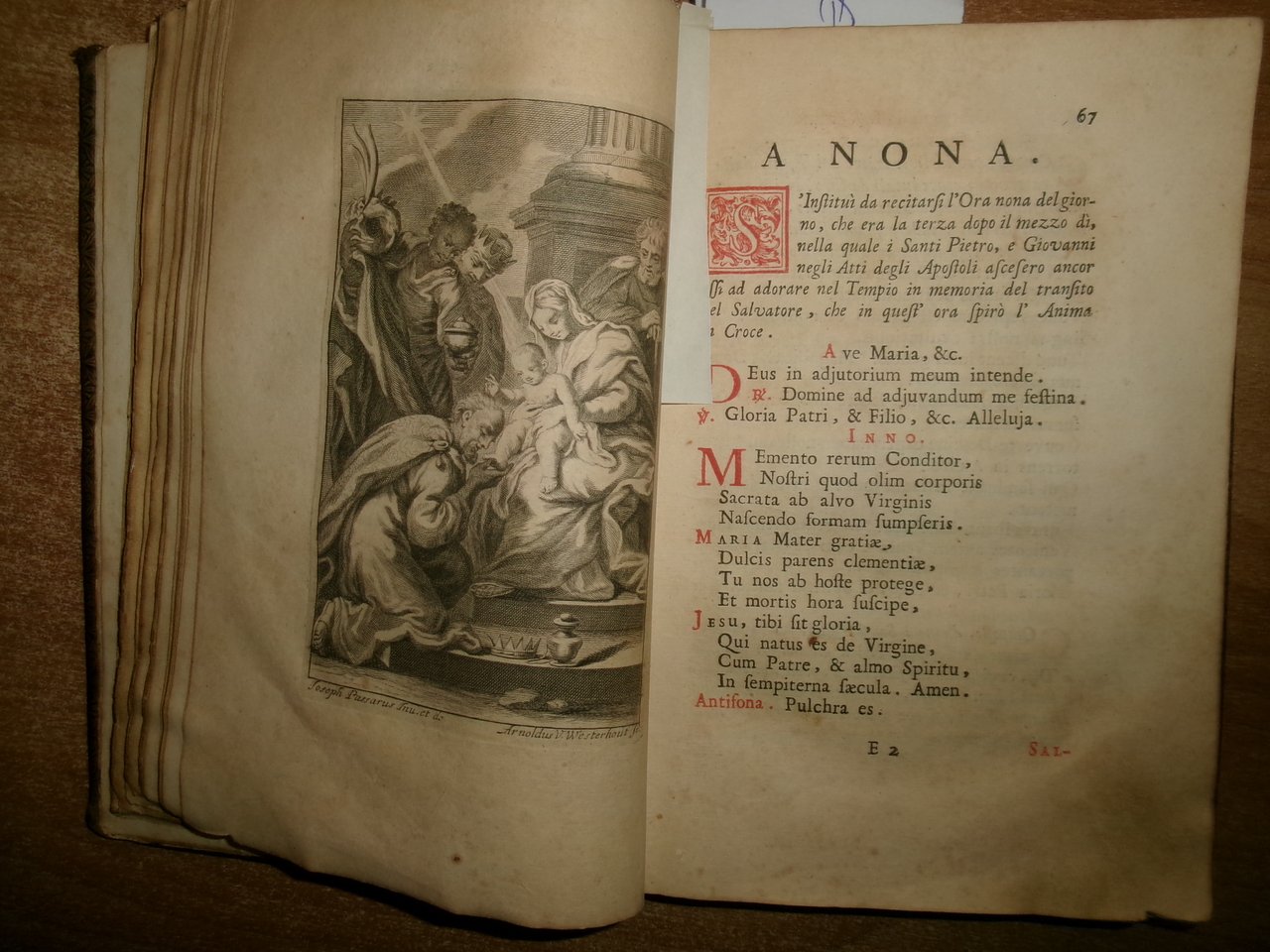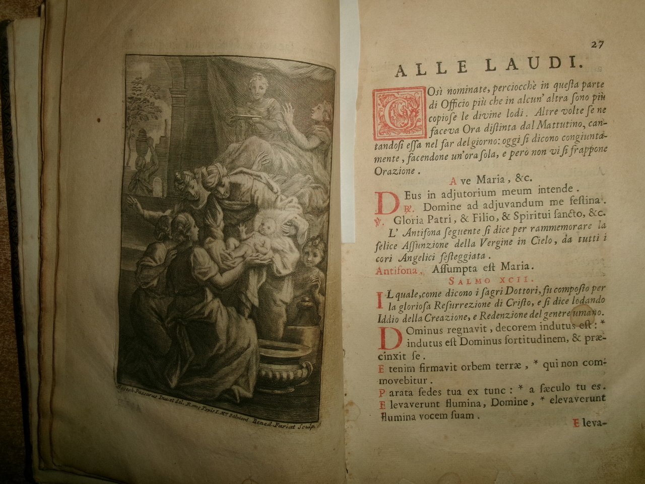 Officio della B. V. Maria per tutti i tempi dell' anno, Con le dichiarazioni, e spiegazioni dell' Abate Alessandro Mazzinelli. Dedicato alli Gloriosissimi Santi GIOACCHINO, ed ANNA. Roma: Gioacchino e Giovanni Giuseppe Salvioni, Stampatori Pontificii Vaticani, 1756. In-8° , splendita legatura in piena pelle coeva, dorso a nervetti, ricchi fregi in oro sui piani e al dorso. [24], 407, [1] pp. 2 parti, l'Ufficio dei Morti con titolo separato. Stampato in rosso e nero. Frontespizio inciso e 15 incisioni in rame a piena pagina di Arnold Van Weserhout e Jacob Frey secondo Joseph Passarus (Giuseppe Passaro), due vignette incise del titolo e 12 vignette della cordiera, alcune non firmate, altre di Frey secondo Passaro o di M. Schedi (incisore), 3 iniziali incise, numerose iniziali xilografiche stampate in rosso. Testo in italiano e latino. Bell' esemplare nonostante un lieve alone di umidità nel margine vicino al dorso delle prime pagine ed alcune macchioline in poche pagine. Neg. Mens. Bianca cassa entro busta trasp.