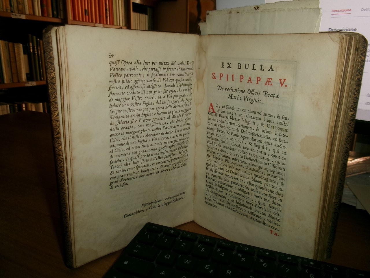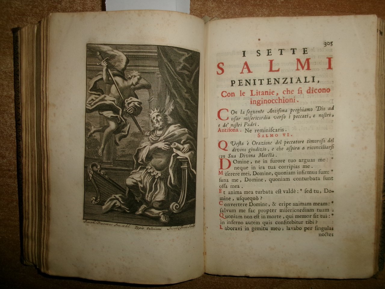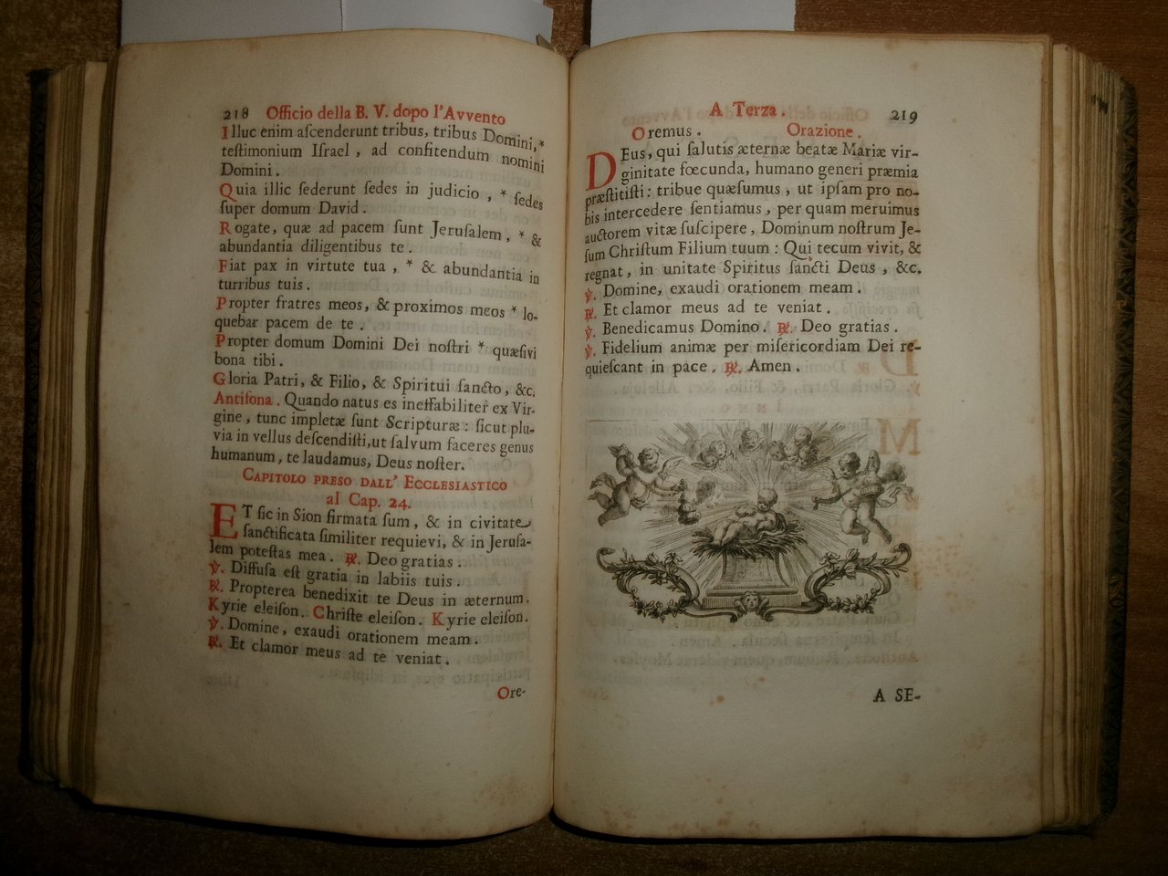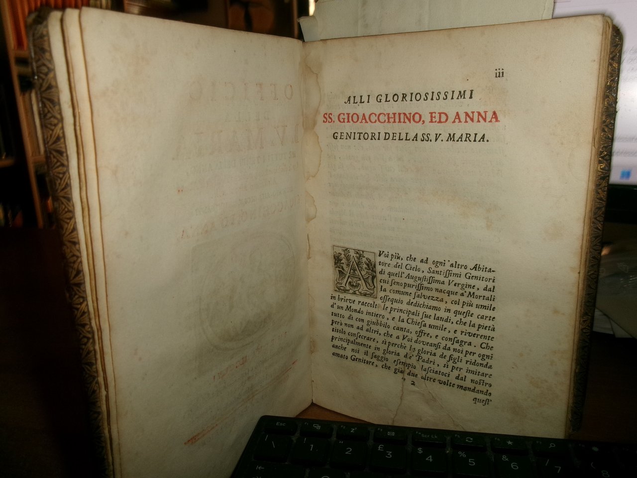 Officio della B. V. Maria per tutti i tempi dell' anno, Con le dichiarazioni, e spiegazioni dell' Abate Alessandro Mazzinelli. Dedicato alli Gloriosissimi Santi GIOACCHINO, ed ANNA. Roma: Gioacchino e Giovanni Giuseppe Salvioni, Stampatori Pontificii Vaticani, 1756. In-8° , splendita legatura in piena pelle coeva, dorso a nervetti, ricchi fregi in oro sui piani e al dorso. [24], 407, [1] pp. 2 parti, l'Ufficio dei Morti con titolo separato. Stampato in rosso e nero. Frontespizio inciso e 15 incisioni in rame a piena pagina di Arnold Van Weserhout e Jacob Frey secondo Joseph Passarus (Giuseppe Passaro), due vignette incise del titolo e 12 vignette della cordiera, alcune non firmate, altre di Frey secondo Passaro o di M. Schedi (incisore), 3 iniziali incise, numerose iniziali xilografiche stampate in rosso. Testo in italiano e latino. Bell' esemplare nonostante un lieve alone di umidità nel margine vicino al dorso delle prime pagine ed alcune macchioline in poche pagine. Neg. Mens. Bianca cassa entro busta trasp.