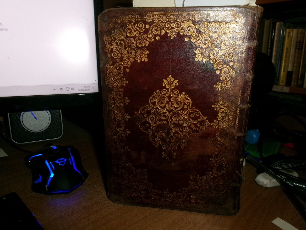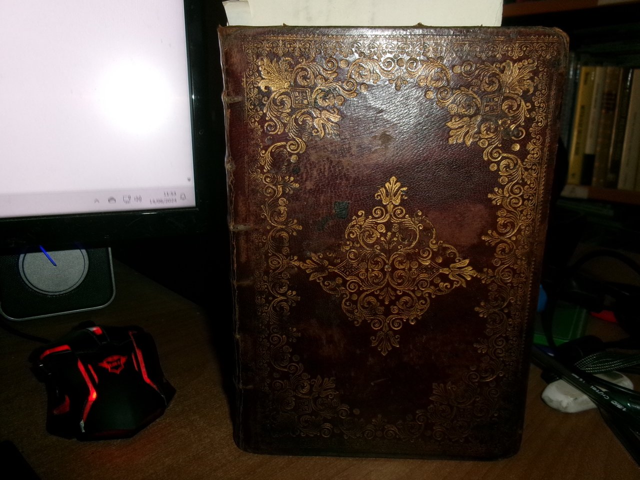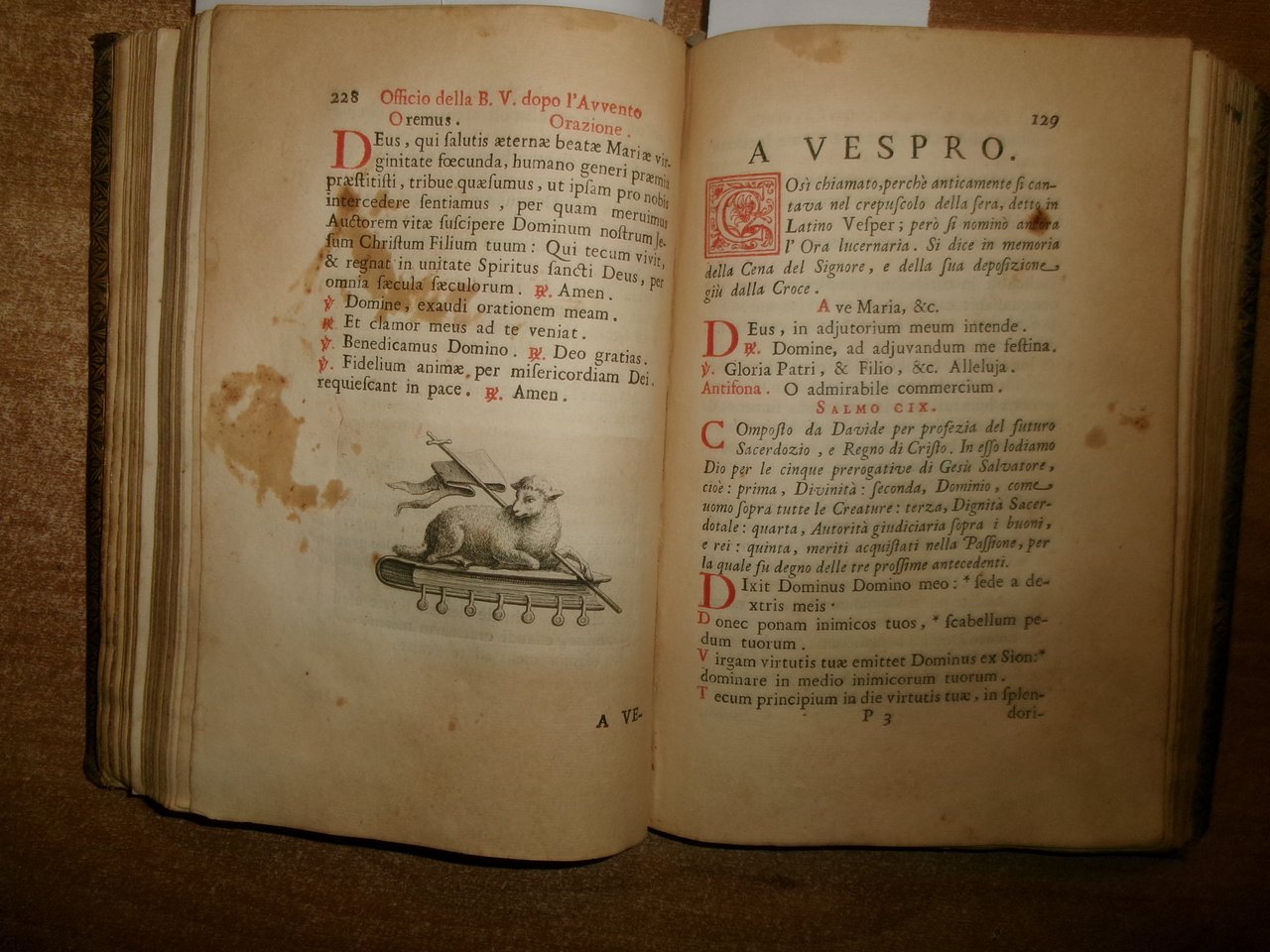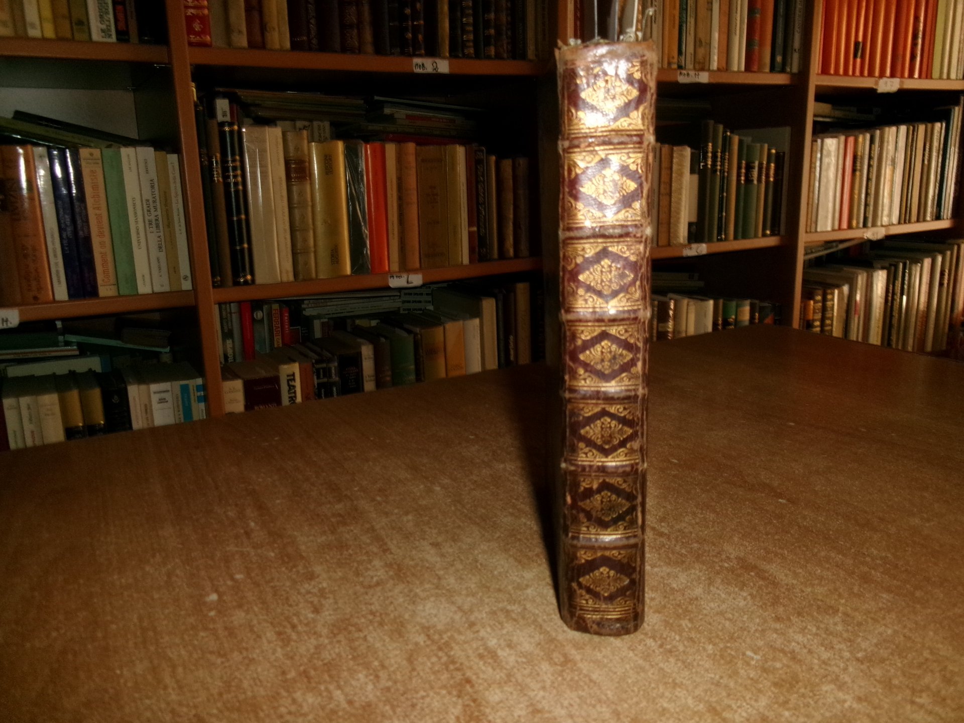 Officio della B. V. Maria per tutti i tempi dell' anno, Con le dichiarazioni, e spiegazioni dell' Abate Alessandro Mazzinelli. Dedicato alli Gloriosissimi Santi GIOACCHINO, ed ANNA. Roma: Gioacchino e Giovanni Giuseppe Salvioni, Stampatori Pontificii Vaticani, 1756. In-8° , splendita legatura in piena pelle coeva, dorso a nervetti, ricchi fregi in oro sui piani e al dorso. [24], 407, [1] pp. 2 parti, l'Ufficio dei Morti con titolo separato. Stampato in rosso e nero. Frontespizio inciso e 15 incisioni in rame a piena pagina di Arnold Van Weserhout e Jacob Frey secondo Joseph Passarus (Giuseppe Passaro), due vignette incise del titolo e 12 vignette della cordiera, alcune non firmate, altre di Frey secondo Passaro o di M. Schedi (incisore), 3 iniziali incise, numerose iniziali xilografiche stampate in rosso. Testo in italiano e latino. Bell' esemplare nonostante un lieve alone di umidità nel margine vicino al dorso delle prime pagine ed alcune macchioline in poche pagine. Neg. Mens. Bianca cassa entro busta trasp.