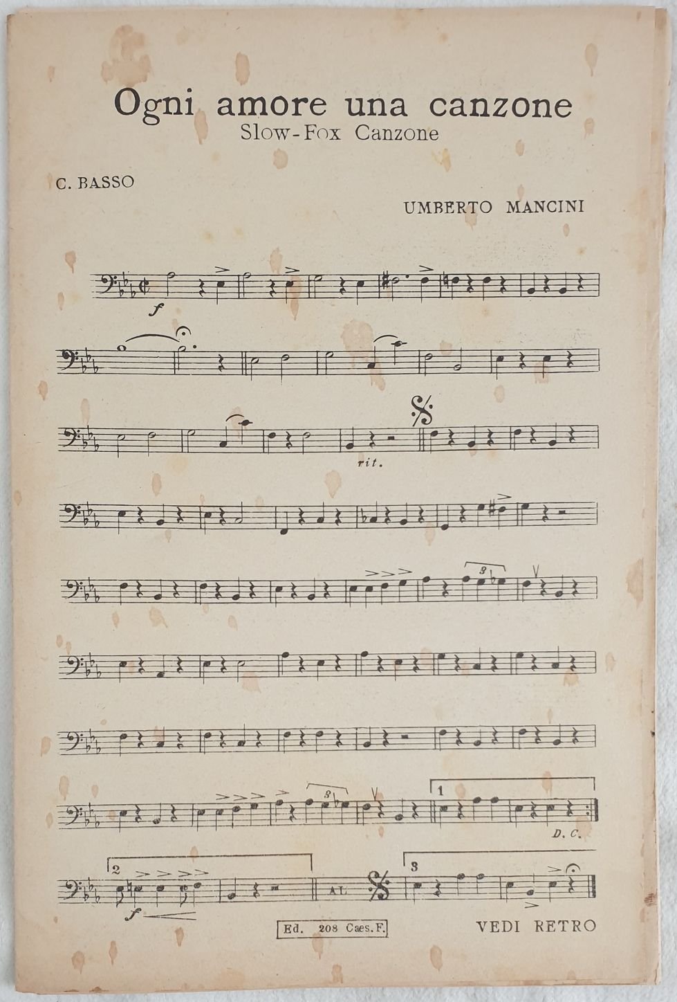 Partitura completa per orchestra degli anni '30 delle melodie di Umberto Mancini "Ogni amore una canzone" e "Moonlight Serenade".<BR>GENERE: Slow fox STRUMENTI: violini; violoncello, contrabasso, violoncello, sassofono, tromba, trombone, sassofono, banjo, batteria ANNO: anni '30 DIMENSIONI: In 8. cm 26,5x18<BR>PAGINE: pp. 26 CONDIZIONI: Buone condizioni. Copertina mancante. Complete score for orchestra of 1930's of the melodies of Umberto Mancini "Ogni amore una canzone" and "Moonlight Serenade".<BR>MUSIC: Slow fox STRUMENTI: violin; violoncello, contrabass, saxophone, trumpet, trombone, saxophone, banjo, drums YEAR: 1930's SIZE: In 8. cm 26,5x18 PAGES: pp. 26 CONDITIONS: Good conditions. cover lacks