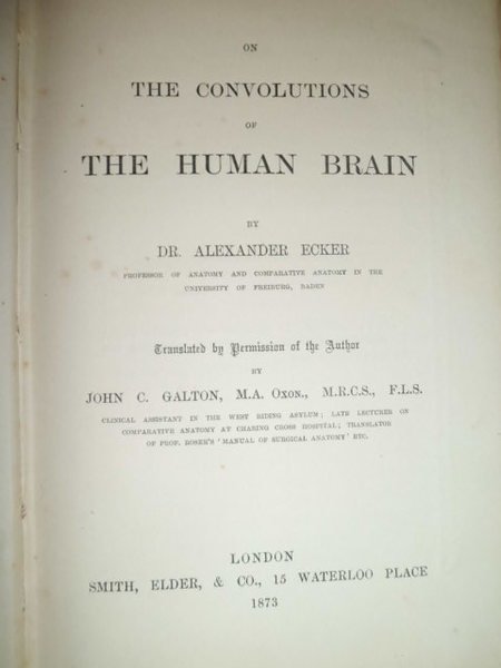 ECKER, Alexander. Translated by John C. Galton. London, Smith, Elder & Co., 1873. In-8°, tela edit. xxx, 70 pp. con alcune illustrazioni n.t. << A. Ecker of Friburg, with obsessional exactitude gave on even more detailed account than turner of the gyri and sulci. His little book greatly contributed to the dissemination of his ideas which became better Known than Turner's, there was an English translation in 1873. >> (Clarke-Dewhurst, History of brain function, p. 108). Meyer, Historical aspects of cerebral anatomy, pp. 147-51.