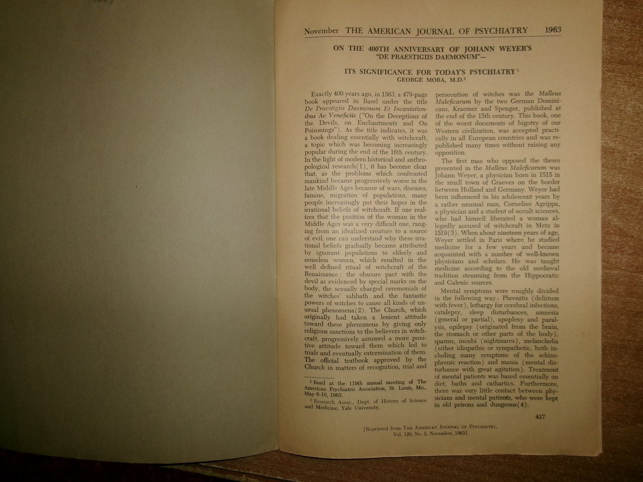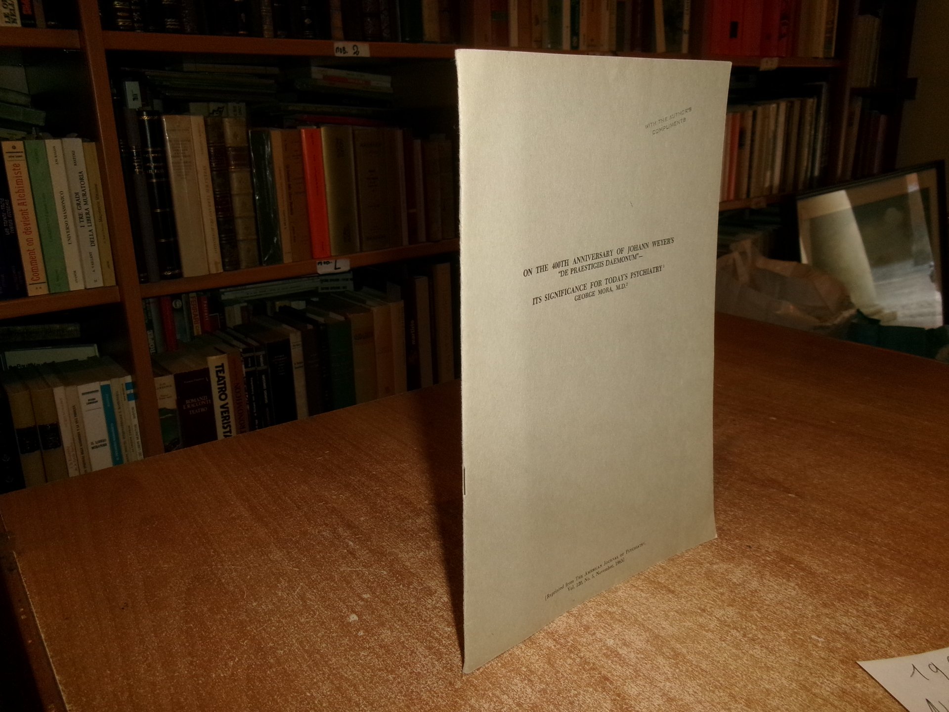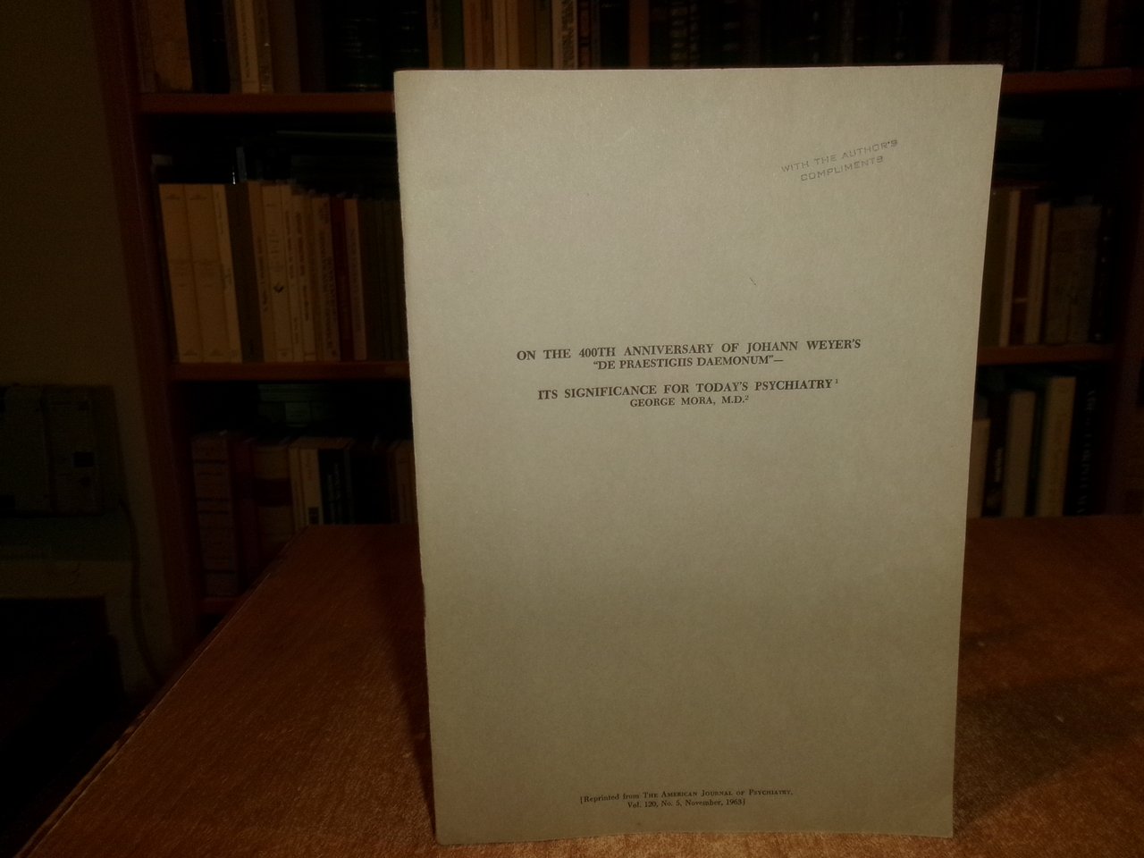 GEORGE MORA. On the 400th Anniversary of JOHANN WEYR'S "De Praestigiis Daemonium". Its significance for today's Psychiatry George Mora. Reprinted from The American Journal of Psychiatry Vol. 120, No. 5, November, 1963. Estratto. In-8°, br. con punti metallici da pag. 417 a pag. 428. Opuscolo in ottimo stato con testo in inglese. Neg. mob. E entro busta trasp.