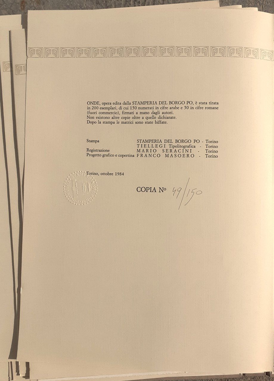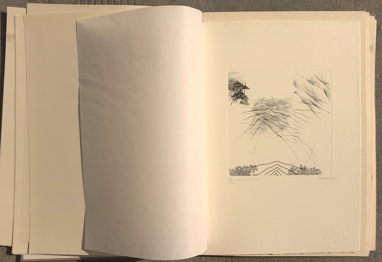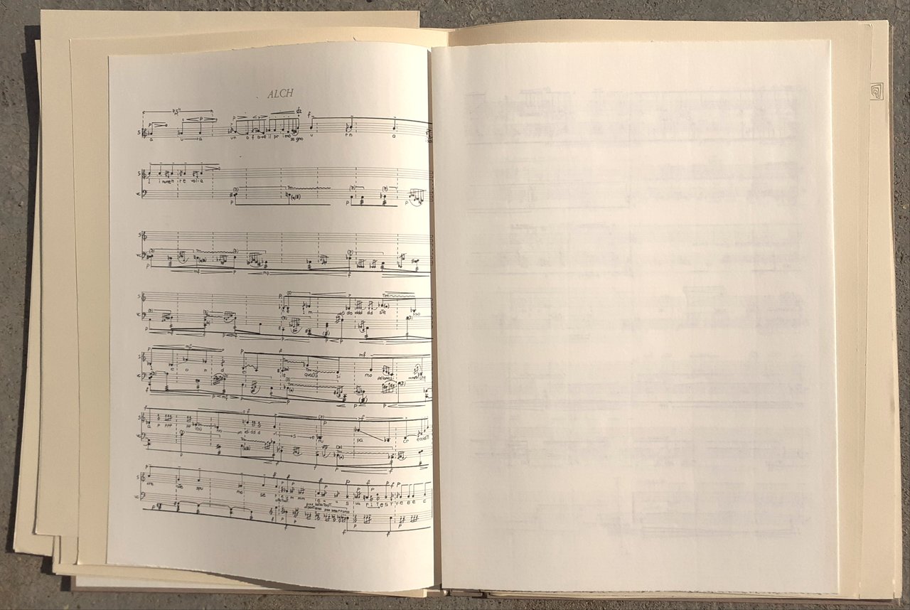 I ed. Opera tirata in 200 esemplari, di cui 150 numerati in cifre arabe e 50 in cifre romane (fuori commercio), firmati a mano dagli Autori. Dopo la stampa le matrici sono state biffate. Copia n. 49/150. Progetto grafico di Franco Masoero. In-4, pp. nn e non rilegate, copertina in cartone illustrata e cofanetto editoriale in cartone. Con disco 33 giri in copertina illustrata, Mario Pessina-esecutori: Maria Armanni-violoncello e Luisa Ciocia Masera-soprano, ALCH" (lato 1: -"ALCH"-10'38''/lato 2: "II"-10'06''). Acqueforti e spartiti in nero. Stato buono (cofanetto con una lievissima abrasione e piccole macchie)"