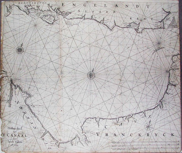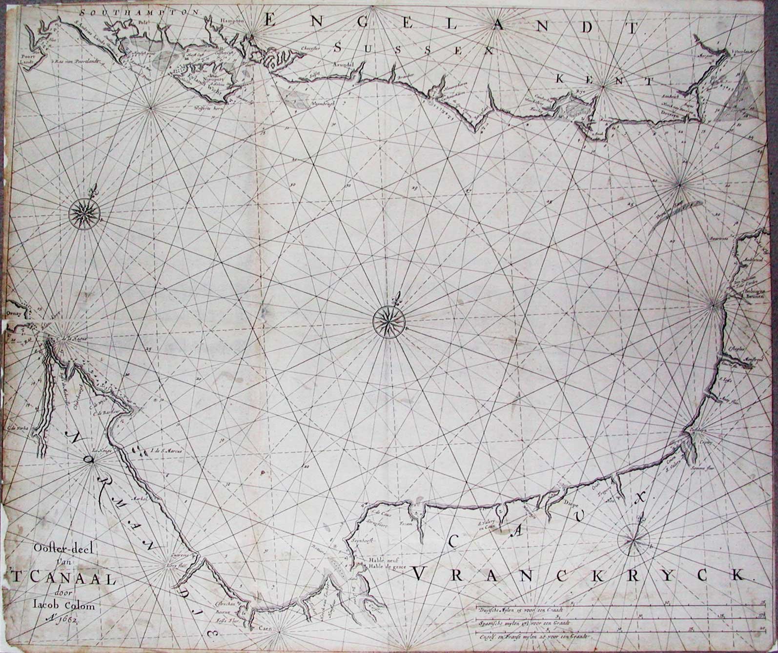 [Amsterdam, c. 1662], carta marittima incisa in rame, mm 545x645, rifilata al filetto di cornice o poco oltre. Bella carta nautica proveniente dall'atlante marittimo "Zee-Atlas, Ofte Water-Wereldt. Inhoudene een korte Beschryvinge Van alle de bekende Zee-Kusten Des Aardtrycks. Nieuwelijcks uyt-ghegheven, door Arnold Colom". Raffigura le coste sulla Manica, fra Dover e Bolougne sur Mer. Piccoli restauri reintegrativi in carta giapponese sul bordo sinistro del foglio. Bruniture. Tracce di piegature.