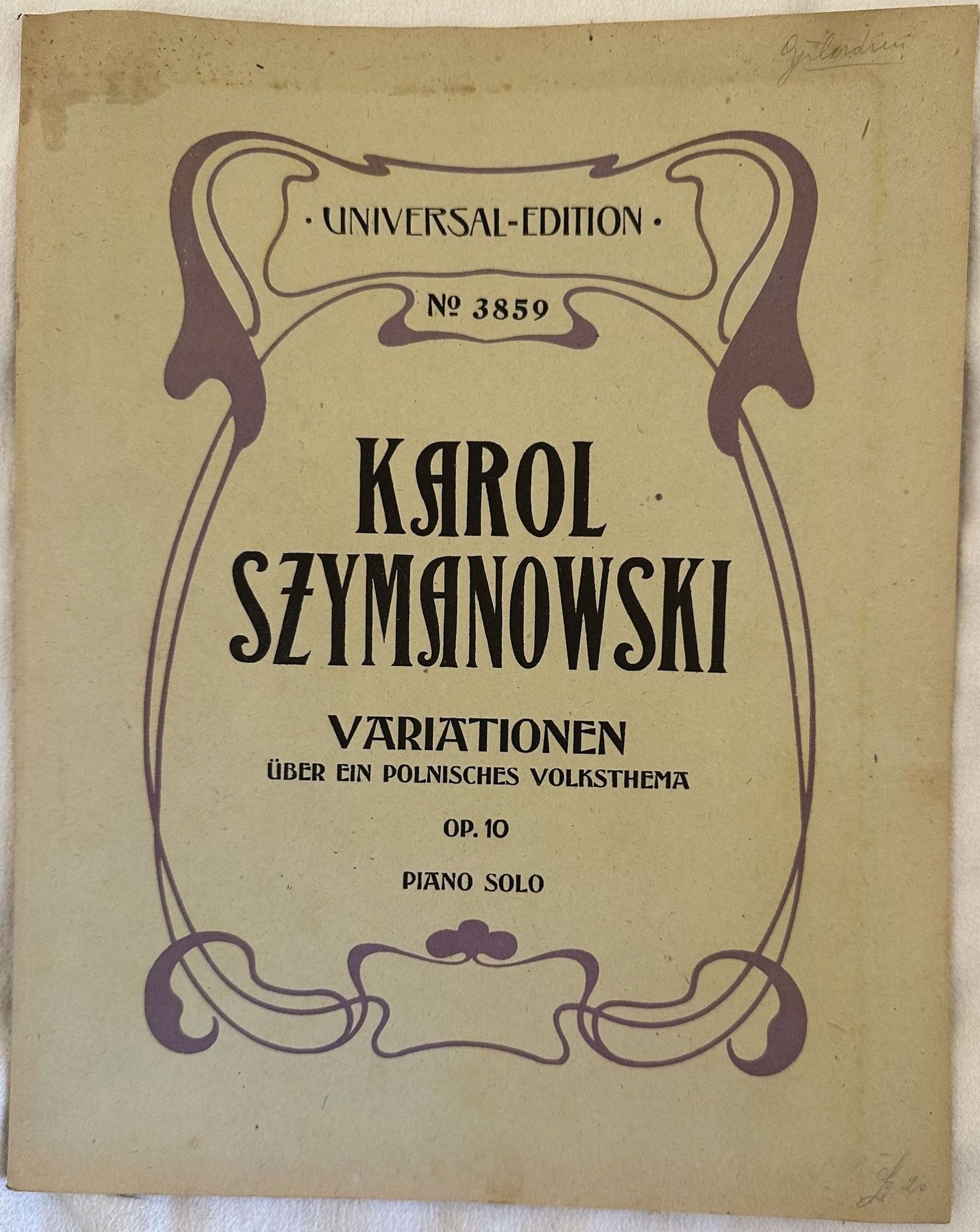 Edizione dei primi del novecento della melodia "Variationen uber ein polnisches Volkstema" dall'opera 10 del compositore e pianista polacco Karol Szymanowski (1882-1937). In buone condizioni. Copertina editoriale in buone condizioni con lievi usure marginali. Legatura in buone condizioni. Pagine in ottime condizioni con rare fioriture. In Folio. cm. 33,5x26,5. Pp. 22.Edition of early 20th century of the melody "Variationen uber ein polnisches Volkstema" from the opera 10 by the polysh composer Karol Szymanowski (1882-1937). In good conditions.Editorial cover in good conditions lightly worn in the extremities. Binding in good conditions. Pages in very good conditions with occasional foxing. In Folio. cm. 33,5x26,5. Pp. 22.