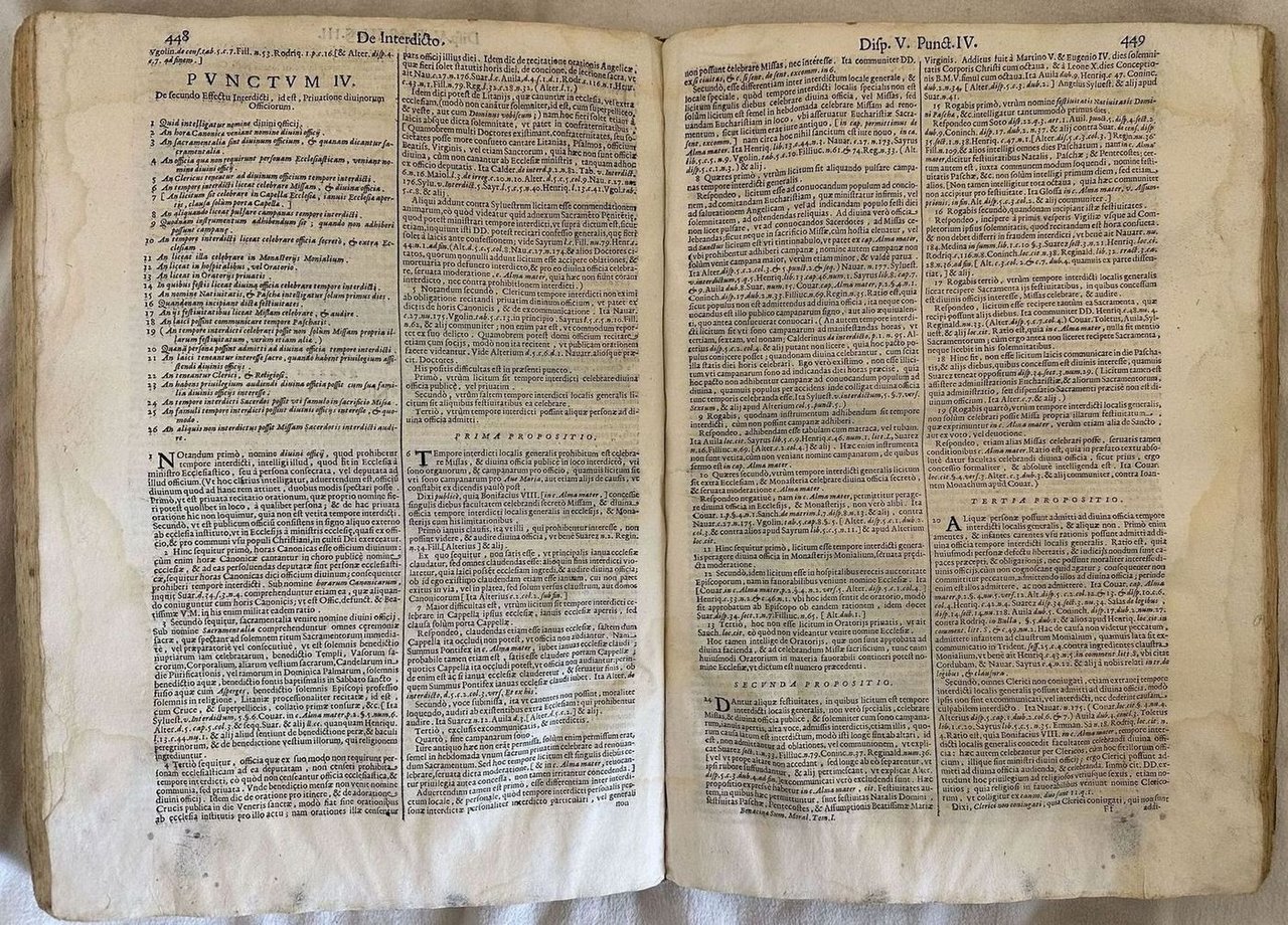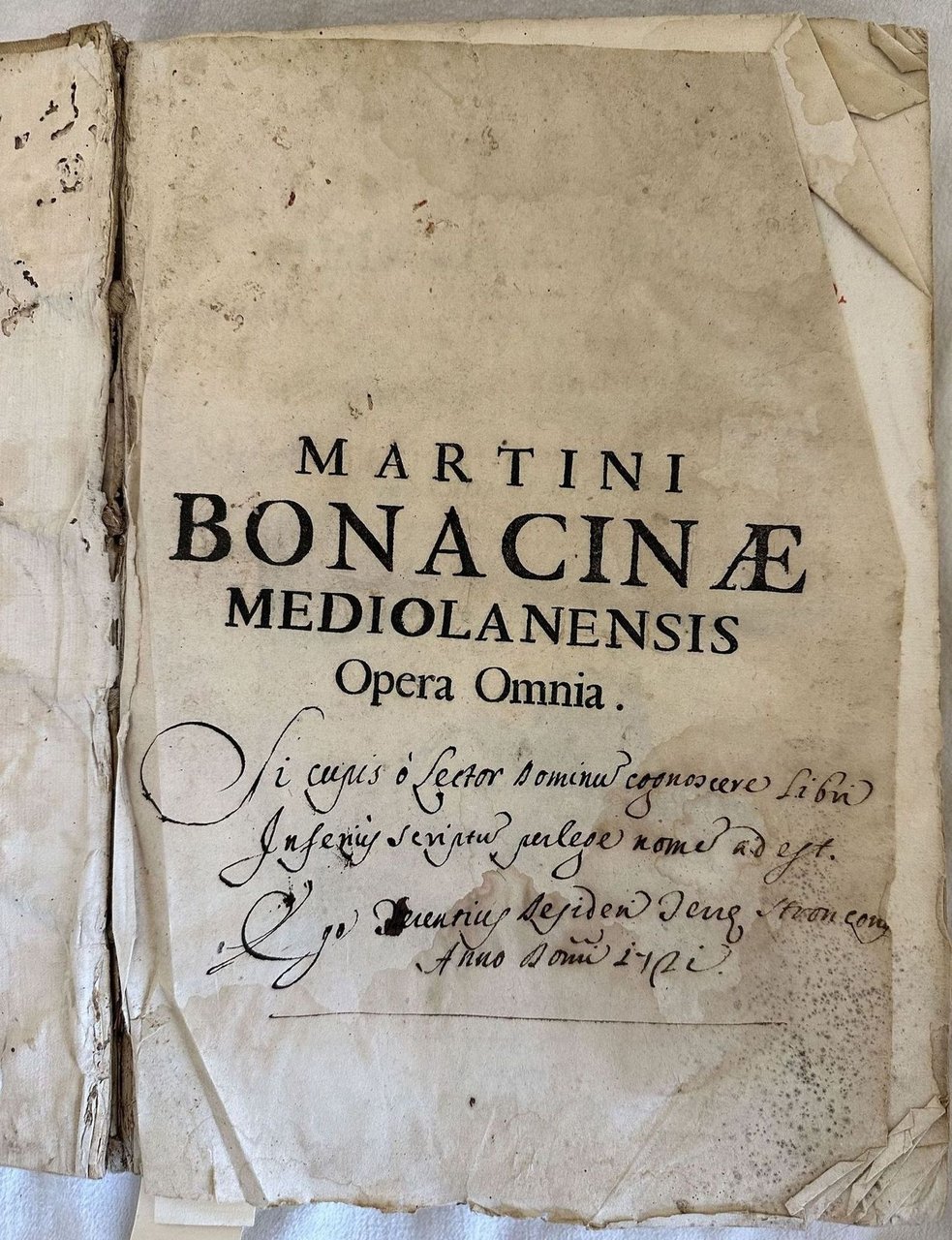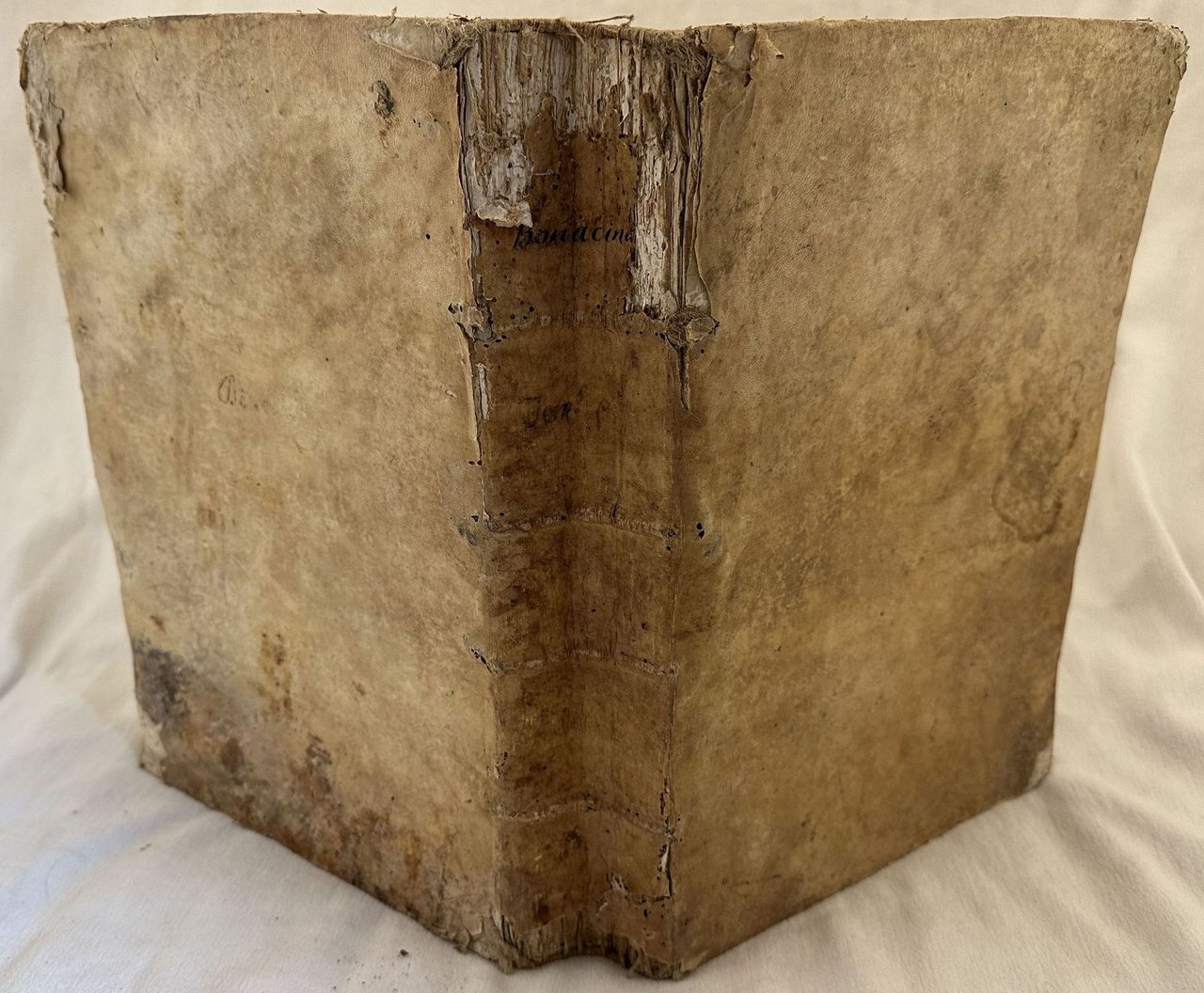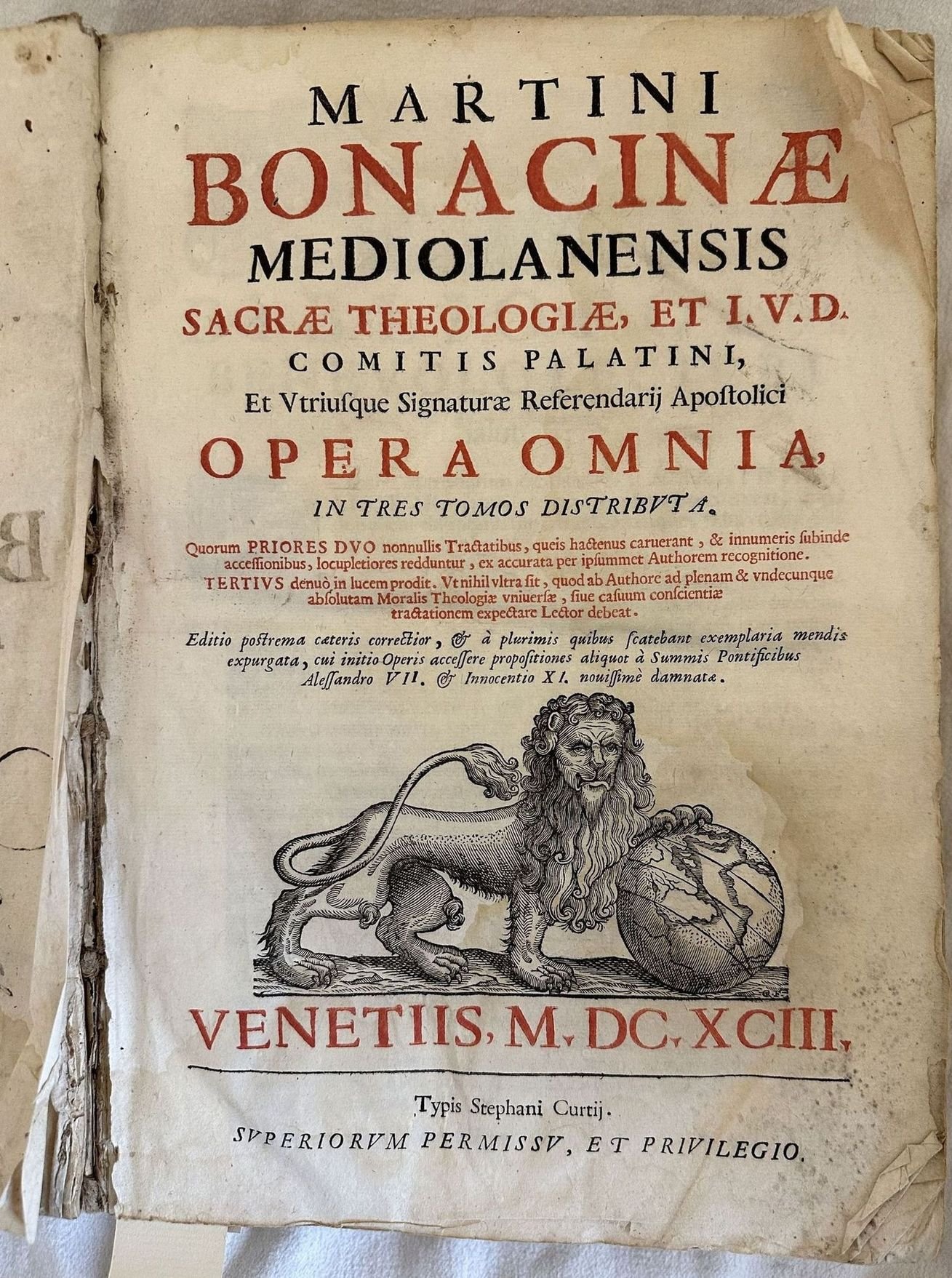 Bella edizione del 1693 di questa Opera omnia del celebre giurista milanese e teologo Martino Bonacina (1585-1631). Bonacina insegnò diritto canonico e civile e le sue opere ebbero il compito di divulgare principi e decreti dogmatici emersi dal Concilio di Trento. L'opera era formata da tre tomi, siamo in possesso del primo tomo solamente. All'interno i celebri trattati "De Sacramentis", "De matrimonio", "De censuris" (assoluzione della censura, scomunica, scomunica dalle eresie, sospensione, interdizione, irregolarità casuate dai delitti e omicidi), "De horis canonicis", "De clausura", De Simonia", De alienatione bonorum ecclesiasticorum, De largitione numerum regularibus interdicta, De beneficiariorum residentia, De fructibus beneficiorum rite impendendis, De obligatione denunciandi deliquentes praesertim haereticos et confessarios ad turpia sollicitantes ecc. Ampie parti dedicate alle scomuniche e alle censure con relative tabelle.<BR>Bellissima legatura in piena pergamena coeva con titolo manoscritto al dorso.<BR>Frontespizi in rosso e nero con bella vignetta. Finissime testatine e finalini che rappresentano una sirena, vedute e la Trinità. Amtiche note manoscritte all'occhietto. Grandi dimensioni. Colalzionata e risultata completa. Copertina in piena pergamena a cinque nervi con titolo manoscritto al dorso in buone condizioni generali con lievi usure e parti mancanti ai margini e dorso. Legatura in buone condizioni. Prima pagina di sguardia e frontespizio in parte staccati. All'interno le pagine si presentano in buone condizioni con fioriture, qualche gora d'umidità marginale e bruniture. In folio. Dim. 33.5x23,5x8 cm. Pp. (20)+772+(38).Beautiful edition of 1693 of this Opera omnia of the famous jurist and theologist from Milan Martino Bonacina (1585-1631). Bonacina teacjed church and civil right and his works had the duty to spread dogmatic principles and decrees from the Council of Trento. the work is made up of three tomes and it is complete. Isndie the famous treaties "De Sacramentis", "De matrimonio", "De censuris" (absolution of censorship, scommunication, scommunication of heresies, suspension, interdition, irregularities caused by murders), "De horis canonicis", "De clausura", De Simonia", De alienatione bonorum ecclesiasticorum, De largitione numerum regularibus interdicta, De beneficiariorum residentia, De fructibus beneficiorum rite impendendis, De obligatione denunciandi deliquentes praesertim haereticos et confessarios ad turpia sollicitantes Wide parts dedicated to scomunications and censorships with charts.<BR>Very beautiful full parchment coeval cover with manuscripted title in the spine.<BR>Red and black title pages with vignette. Some fine vignettes inside picturing a mermaid, some views and trinity. Ancient handwritten notes in the first title page.<BR>Of big size. Collationed complete work. Full parchment coeval cover with five nerfs and manuscripted title in the spine in good general conditions lightly worn with missing parts in the edges and spine. Binding in good conditions. First title page and title page partially detached. Inside pages are in good conditions with foxing, dump stains in the edges and yellowings. In folio. Dim. 33.5x23,5x8 cm. Pp. (20)+772+(38).