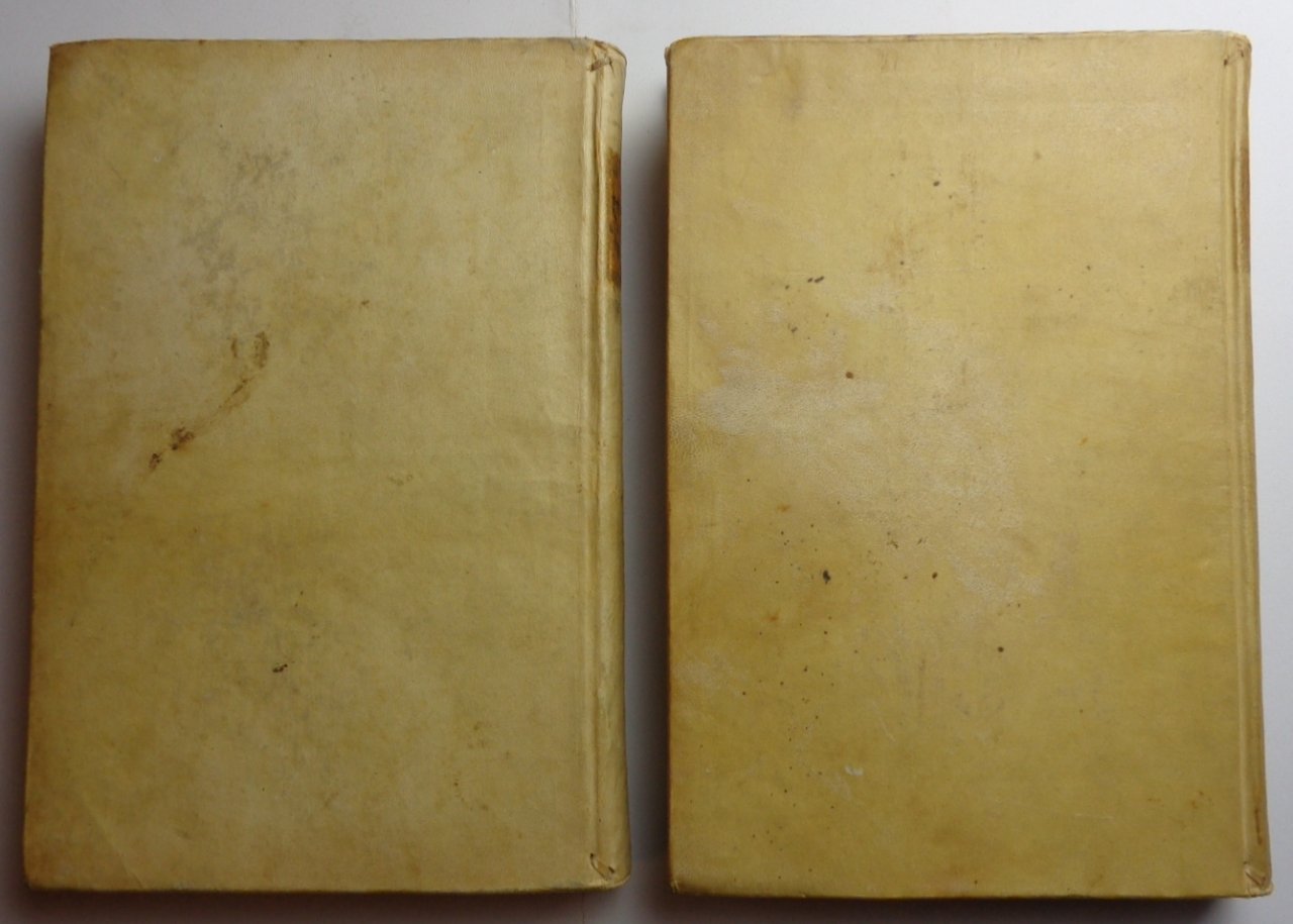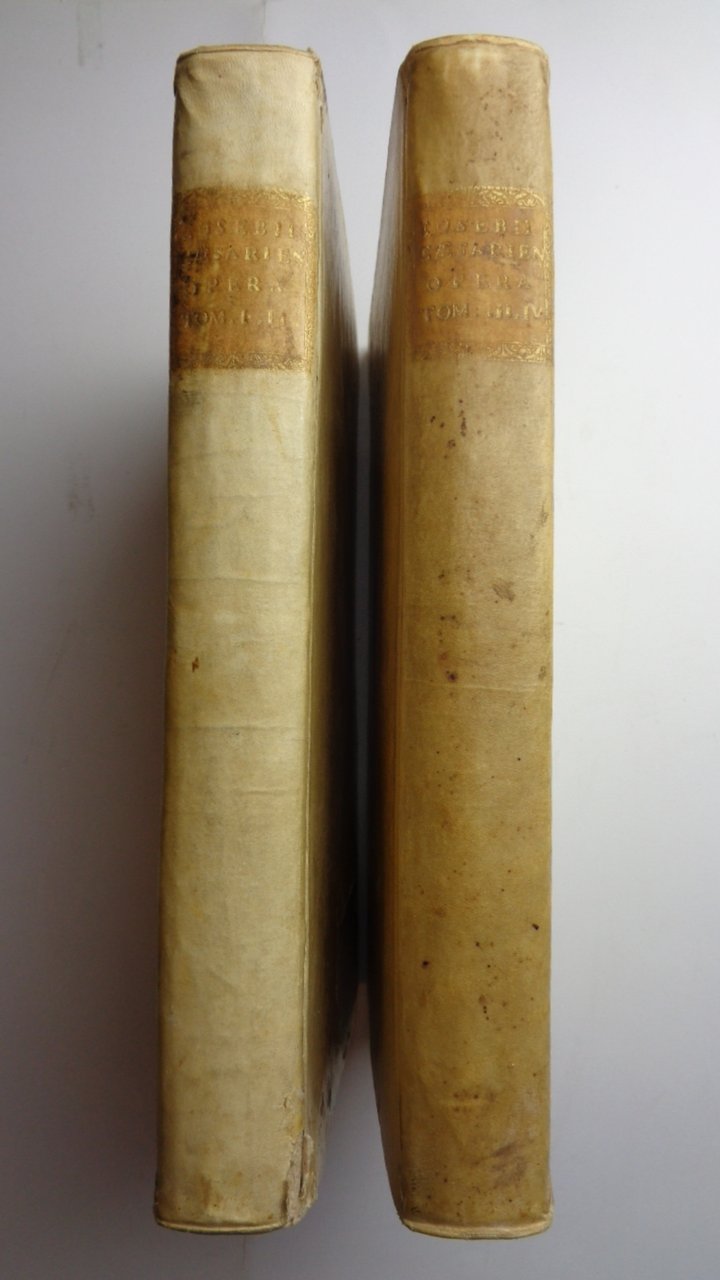 Quattro tomi riuniti in due volumi in folio piccolo (20x31 cm). Paginazione: (36)-214 pp.-1 fb. ; 287 pp. ; 22-(1) pp.- 2 ff.nn.-169 ff.-(3) pp. Pagina di titolo con grande cornice incisa di Hans Holbein ( The beautiful title border by Hans Holbein the younger shows Petrus on the left, Paulus on the right, the symbols of the four Evangelists in the corners, the Holy Child riding on a lion in the lower portion, the coat of arms of the city of Basel at the head, flanked by two basilisks, with a banderole "Inclyta Basilea". This border was first cut for the Adam Petri edition of Luther's New Testament (Basle 1523). Stemma dello stampatore all'ultimo foglio, mentre il nome del tipografo Henricus Petrus è stato biffato a penna al colophon (excudebat Henricus Petrus, mense Augusto 1542). Bruniture ad alcune pagine (per es. all'inizio del vol 2) dovute al tipo di inchiostro; qualche piccola gora marginale; ma nel complesso ottimo esemplare a larghi margini. La cancellazione a penna del nome del tipografo dimostra la provenienza cattolica di questo volume: Henricus Petrus era infatti protestante e stampatore della Bibbia di Lutero; i suoi libri in Italia circolavano dunque senza permesso ecclesiastico. La firma di possesso alla pagina di titolo è di Alessandro de Curtis. Legatura coeva in piena pergamena, tassello di titolo dorato al dorso; una mancanza (7x10 cm) al piatto del primo volume, in basso.