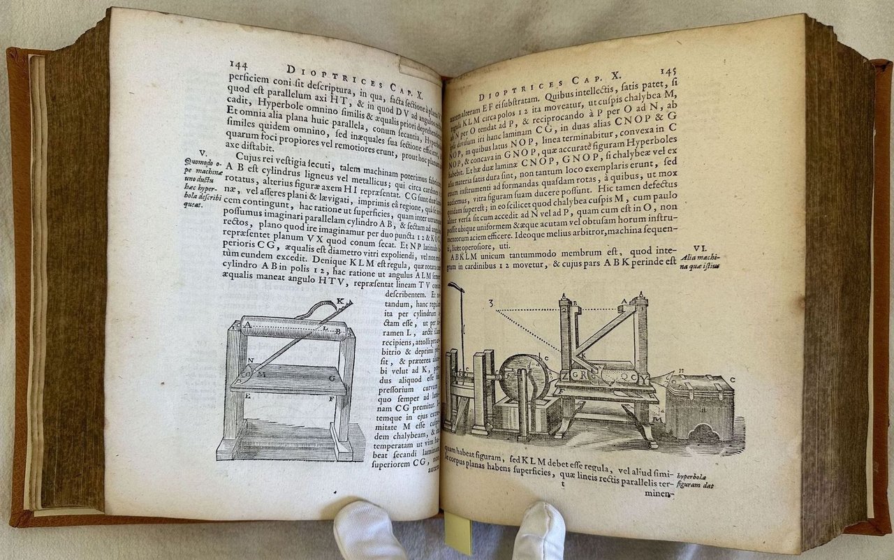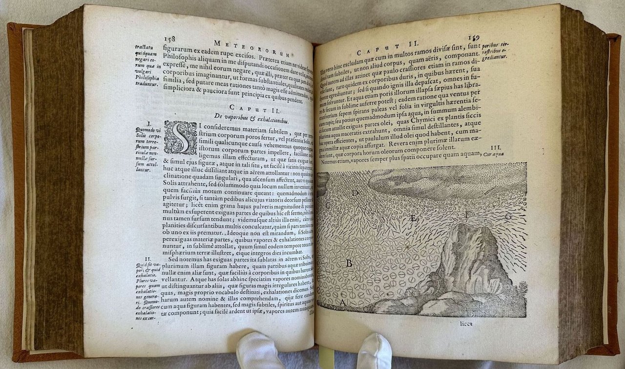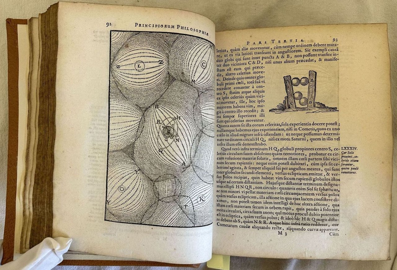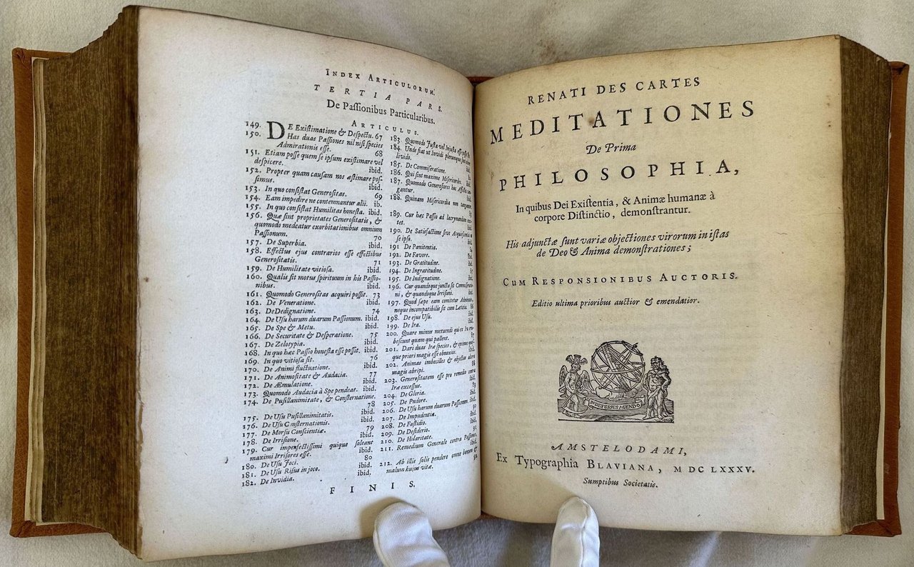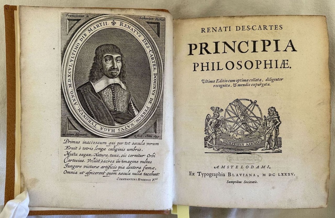 Finissima edizione illustrata del 1685 di questa raccolta di opere del filosofo francese René Descartes (1596-1650). L'opera, composta con l'intento di sostitutirsi al modello aristotelico utilizzato nelle Università inglesi e francesi, espone il rivoluzionario concetto per cui "in assenza di forze esterne il moto di un oggetto sarà uniforme e in linea retta", principio che Newton stesso estrapolò per inserirlo nei suoi Principia e che viene generalmente collegato al suo "Primo pincipio della dinamica". All'interno le seguenti opere con frontespizio proprio: Principiorum philosohpiae; Specimina philosophiae seu dissertatio de methodo dioptrice et meteora; Passiones animae; Meditationes de prima philosophia; appendix continens objectiones in meditationes de prima philosophia; Epistola Renati Descartes ad celeberrimum virum D. Gisbertum Voetium. In questa prima edizione Blaeu ha stampato pagina per pagina le precedenti edizioni collettive Elzeviriane del 1664, 1672 e 1677. Alcune incisioni nel testo di esempi scientifici e strumenti. Ritratto di Descartes in antiporta incso da Franciscus van Schooten. Tagli marmorizzati. In eccellenti condizioni. Copertina in piena pelle moderna in ottime condizioni generali con lievi usure ai margini e dorso. Legatura in buone condizioni. Pagine in buone condizioni con rare fioriture. In 8. cm. 21,5x17,5. Pp. (3)+(39)+222+(2)+(16)+248+(24)+92+(4)+(16)+191+(1)+164+88+(1). Peso Kg. 1,600Very fine illustrated edition of 1685 of this collection of works by the french phylosopher René Descartes (1596-1650). The work was written with the aim to substitute to the Aristotelic model used in british and french universities. It exposes the revolutionary concept according to whom "in absence of external forces the movement of a item will be uniform and in right line, a principle that the same Newton used and inserted in his Principia and that is generally connected in his "Primo pincipio della dinamica". Inside the following works with its own title page: Principiorum philosohpiae; Specimina philosophiae seu dissertatio de methodo dioptrice et meteora; Passiones animae; Meditationes de prima philosophia; appendix continens objectiones in meditationes de prima philosophia; Epistola Renati Descartes ad celeberrimum virum D. Gisbertum Voetium. In this first edition Blaeu published page per page the previous collective editions Elzeviriane of 1664, 1672 and 1677. Some engravings in the text of scientiphical examples and instruments. Portrait of Descartes in the frontspice engraved by Franciscus van Schooten. Marbled external edges. In excellent conditions. Modern leather cover in very good conditions lightly worn in the extremities. Binding in good conditions. Pages in good conditions with occasional foxing. In 8. cm. 21,5x17,5. Pp. (3)+(39)+222+(2)+(16)+248+(24)+92+(4)+(16)+191+(1)+164+88+(1). Peso Kg. 1,600