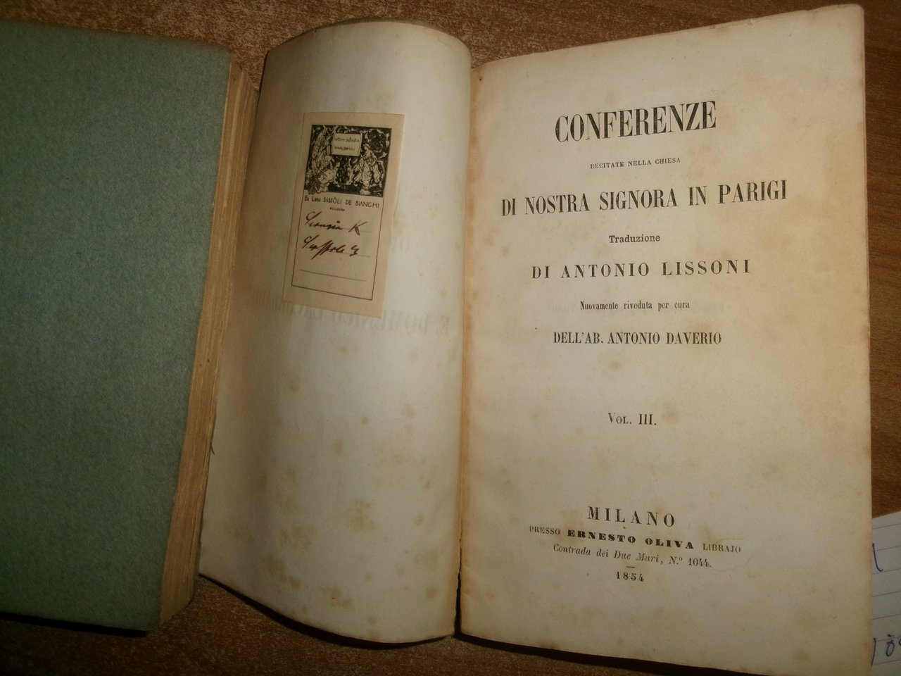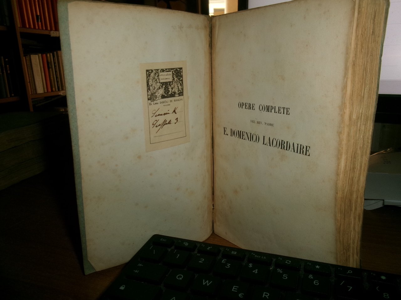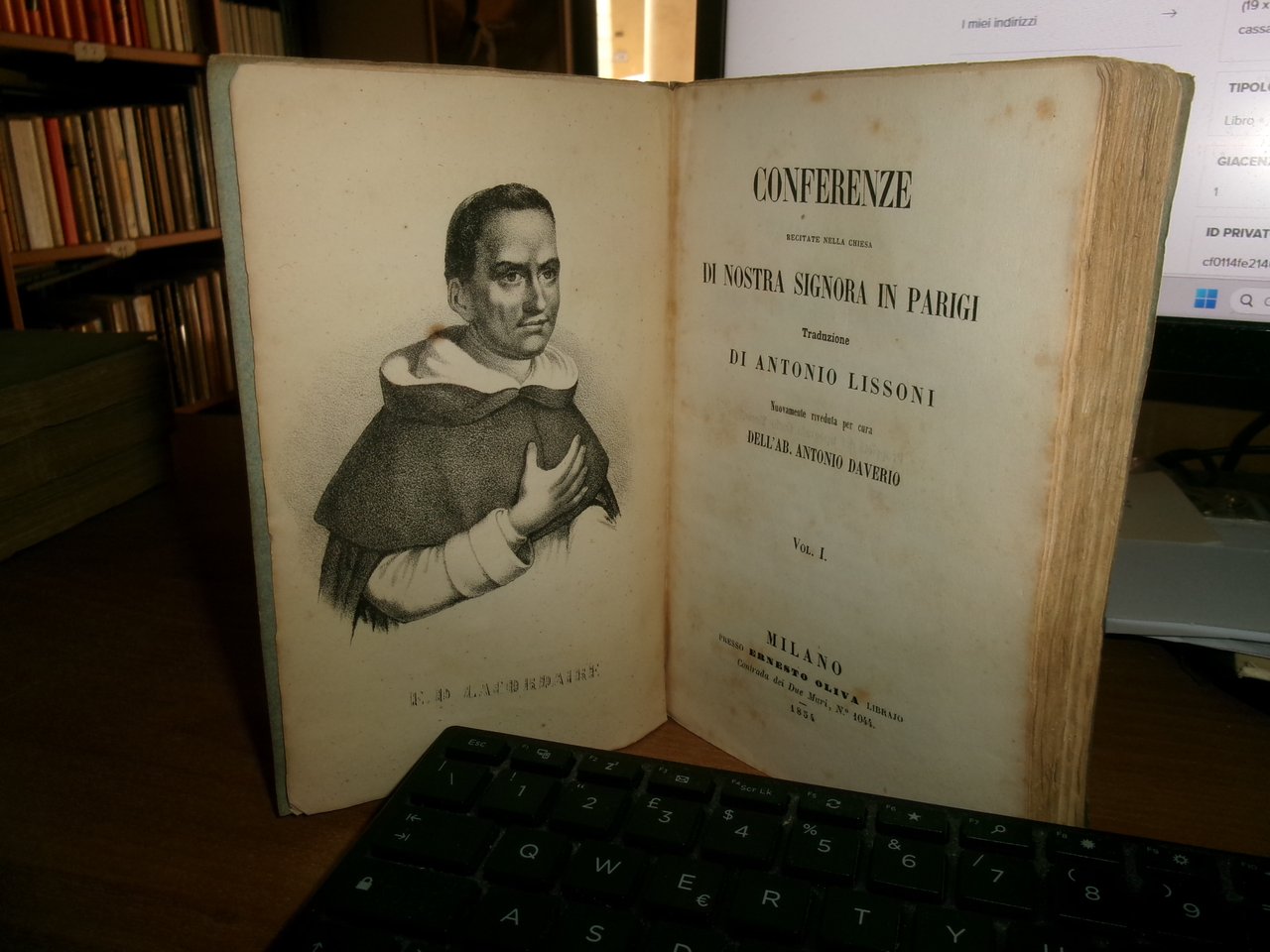 TRAD. ANTONIO LISSONI. Nuovamente riveduta per cura Dell' AB. ANTONIO DAVERIO. Milano, Presso Ernesto Oliva, 1854. Opere Complete del Rev. Padre E. DOMENICO LACORDAIRE. Vol. I. Conferenze Recitate nella Chiesa Di Nostra Signore in Parigi. (3) volumi in-8° piccolo, br. con titolo al dorso in etichetta. xxxvi, 406 pp. con ritratto inciso in antiporta.; 480 pp.; 446 pp.; Elogi funebri Sermoni e Discorsi.406 pp. Normali segni del tempo ma ben conservati. Ex libris al verso dell' occhietto. Uff. C . IV - 7