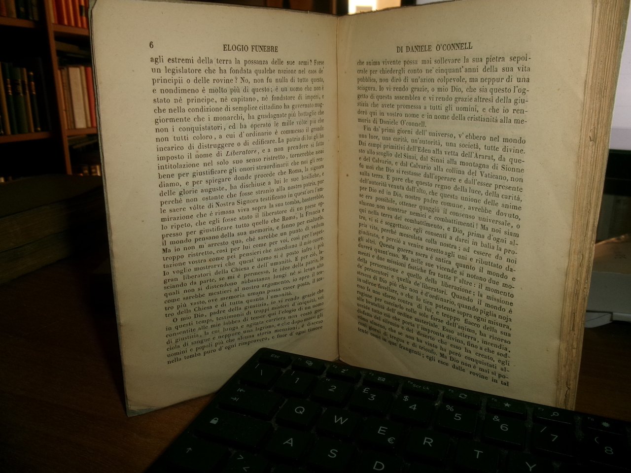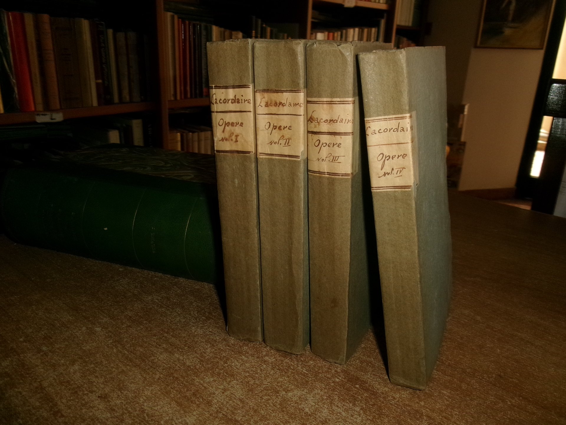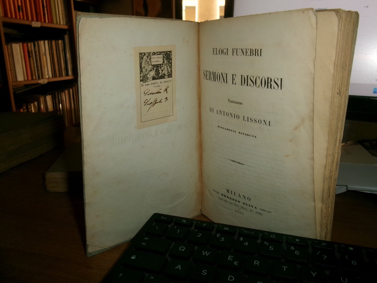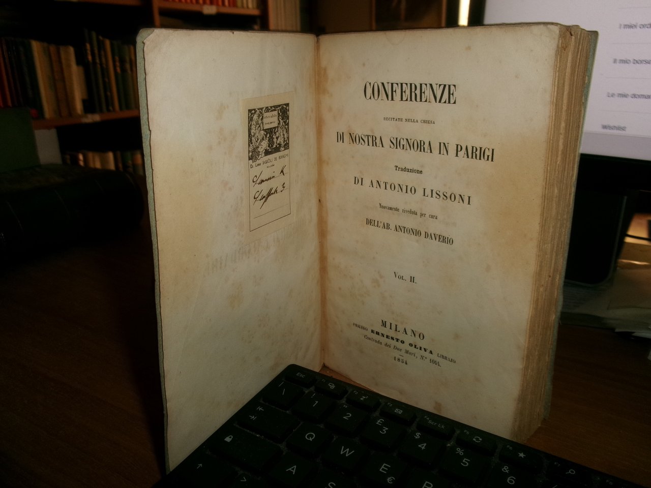 TRAD. ANTONIO LISSONI. Nuovamente riveduta per cura Dell' AB. ANTONIO DAVERIO. Milano, Presso Ernesto Oliva, 1854. Opere Complete del Rev. Padre E. DOMENICO LACORDAIRE. Vol. I. Conferenze Recitate nella Chiesa Di Nostra Signore in Parigi. (3) volumi in-8° piccolo, br. con titolo al dorso in etichetta. xxxvi, 406 pp. con ritratto inciso in antiporta.; 480 pp.; 446 pp.; Elogi funebri Sermoni e Discorsi.406 pp. Normali segni del tempo ma ben conservati. Ex libris al verso dell' occhietto. Uff. C . IV - 7