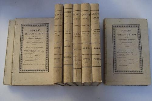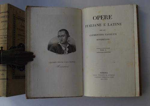 Otto volumi di cm. 21, pp. 2.500 ca. complessive. Ritratto dell'autore inciso all'antiporta del primo volume. Legatura editoriale in cart. rigido con decorazioni e titoli a stampa. Bell'esemplare, genuino ed in ottimo stato di conservazione. Precede la vita compilata da Antonio Cesari. Edizione completa di tutte le opere del letterato trentino (Rovereto 1754-1795). Vi appare l'intera produzione letteraria affiancata a testi di interesse trentino e, al settimo volume, il celebre "Liber memorialis de Caleostro quum esset Roboreti".