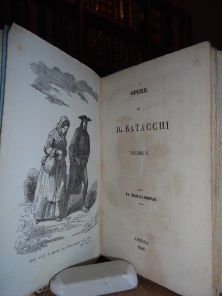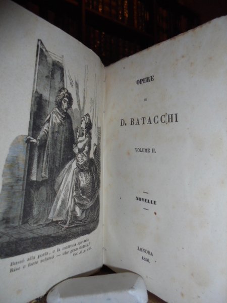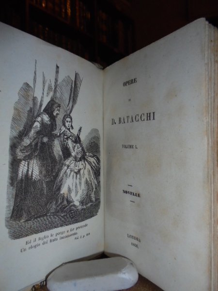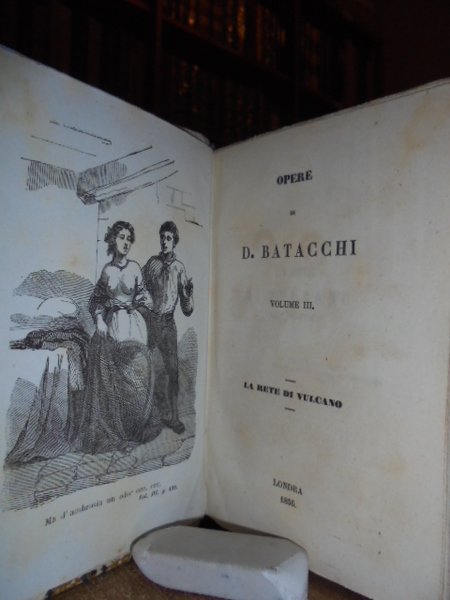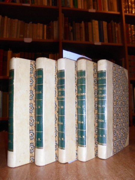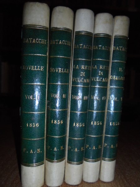 BATACCHI, Domenico Luigi. Londra, 1856. OPERE. Novelle - La Rete di Vulcano - Il Zibaldone. 5 volumi in-16°, m. pergamena coeva con grande tassello al dorso, copertine originali conservate. Complessive 1410 pp. con 5 illustrazioni in antiporta. Timbro di biblioteca privata. Ottimo esemplare di questa rara edizione. Neg. Mob. 5