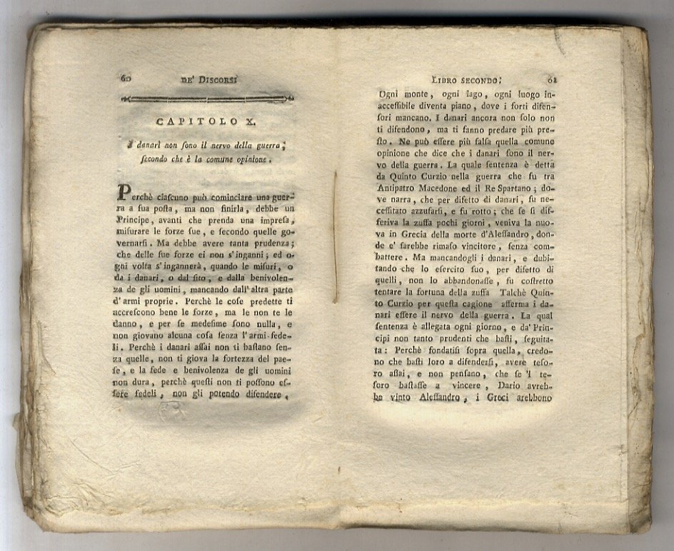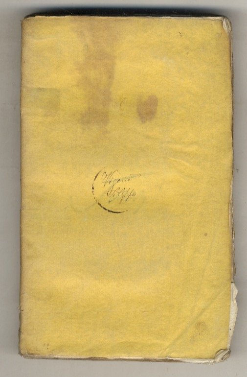 Milano, s.n.t., 1797, in-12, cartoncino giallo coevo, pp. (4), 208. Eleganti fregi xilografici in guisa di testate. Mancanze al dorso Firma coeva d'appartenenza manoscritta alla copertina anteriore (Filippo Viganò). Delle "Opere politiche", in origine concepite in 4 voll., uscirono nello stesso anno e nel successivo altri 5 sotto il titolo generico: "Opere di Niccolò Macchiavelli".