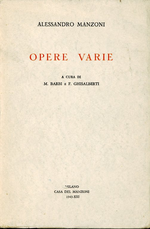 A cura di M. Barbi e F. Ghisalberti. X, 875 p., [2] c. di tav., ritratti, 21 cm. Contiene: Inni sacri e Odi ; Osservazioni sulla morale cattolica ; Il conte di Carmagnola ; Adelchi ; Discorso sopra alcuni punti della storia longobardica in Italia ; e, Scritti vari linguistici e letterari. 858 - Ba Ottimo (Fine)
