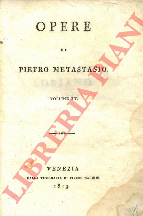 Venezia, Girolamo Tasso, 1819, 16mo (cm. 15,5 x 10) cartonato muto originale, pp. 87 +66 +84 + 78. Contiene: Adriano, Issipile, Demetrio, Olimpiade.