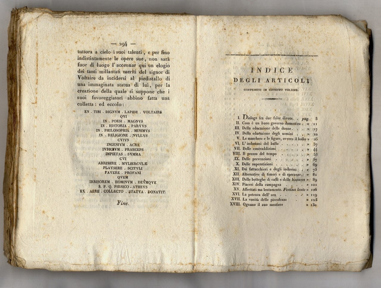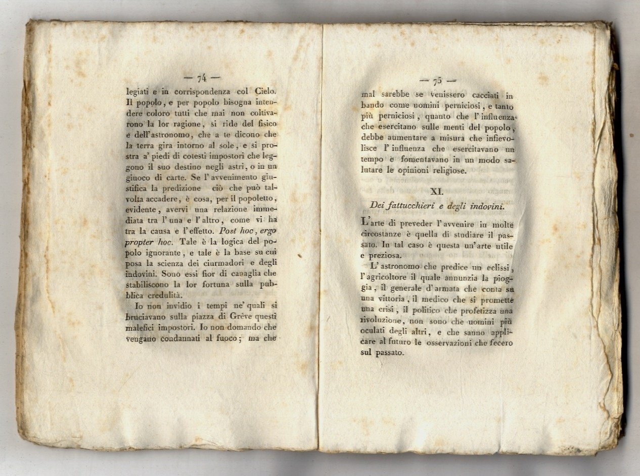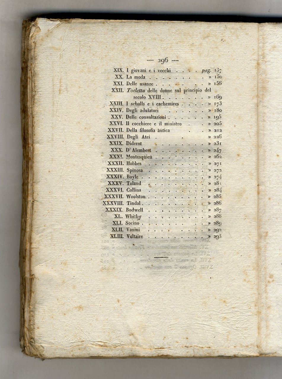 Milano, co'tipi di Giovanni Pirotta, 1821, in-8, brossura editoriale con titolo a stampa su tassello di carta al dorso, pp. 296, [6]. Dal sommario: Della educazione delle donne, Le maschere e le figure, ovvero il ballo, L'indomani del ballo, Dei fattucchieri e degli indovini, Delle botteghe di caffè e delle biscacce, La moda, Toeletta delle donne sul principio del secolo XVIII, ecc., ecc. lievi tracce d'usoe esterne.
