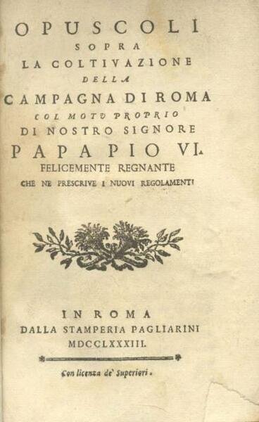 Opuscoli sopra la coltivazione della campagna di Roma. Col motu proprio di nostro signore papa Pio VI felicemente regnante che ne prescrive i nuovi regolamenti.