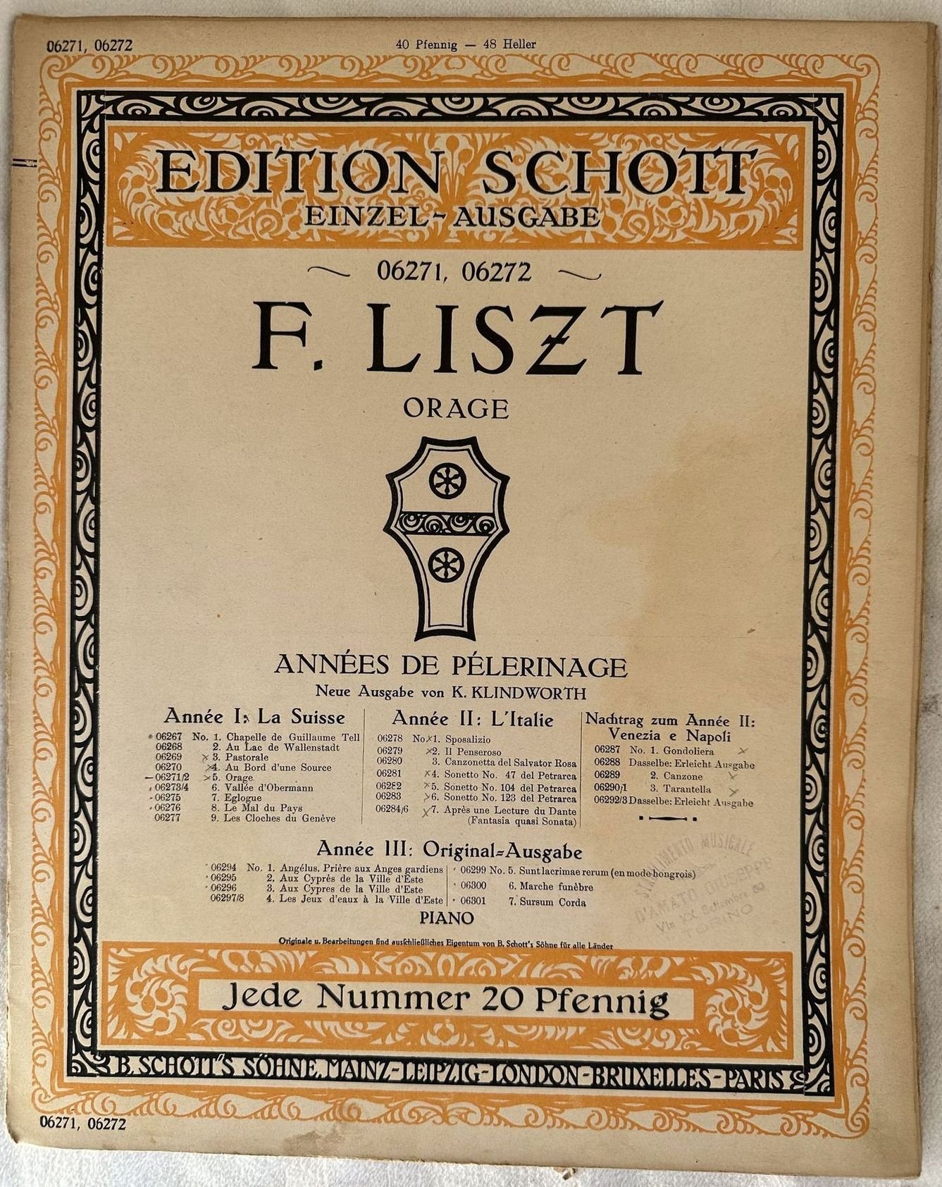 Edizione del 1912 della melodia "Orage" di Franz Liszt (1811-1886) dall'opera "Annees de pelerinage". In buone condizioni. Copertina editoriale in buone condizioni con lievi usure marginali. Dorso coperto da carta. Legatura editorialmente assente. Pagine in buone condizioni con rare fioriture. In Folio. cm. 34x27. Pp. 12 Edition of 1912 of the melody "Orage" by Franz Liszt (1811-1886) from the opera "Annees de pelerinage". In good conditions. Editorial cover in good conditions lightly worn in the extremities. Spine covered by paper. Binding editoriarly lacks. Pages in good conditions with occasional foxing. In Folio. cm. 34x27. Pp. 12.<BR>