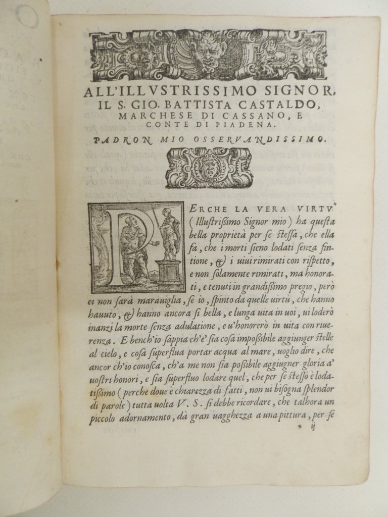 4°, mm 210x14, cc. (36), 1004, legatura in tutta pergamena semirigida con titolo manoscritto al dorso, tagli rossi, ex libris novecentesco al contro-piatto; una gora al centro del piatto anteriore, frontespizio con marca tipografica del Giolito al centro, belle testatine in silografia e moltissimi capilettera istoriati, buon esemplare nitido e fresco nell'impressione, leggermente rifilato al margine alto, con un foro di tarlo alle ultime due carte con perdita di testo, sporadici e lievi aloni ad alcune carte dalla seconda metà del volume. Seconda edizione, solitamente ritenuta superiore al l'originale del 1557 sempre impressa da Giolito a Venezia. “Più bella e più ricca ristampa”, Gamba, 1545; “Edizione assolutamente da preferirsi alla prima. per maggior cura di stampa e per maggiore abbondanza di materie.” Bongi II, 82/83.. *** TUTTI I NOSTRI LIBRI SONO VISIBILI PREVIO CONTATTO MAIL O TELEFONO NELLA NUOVA SEDE DI MILANO: LIBRERIA COSMOPOLIS, VIA JOMMELLI, 22. ***
