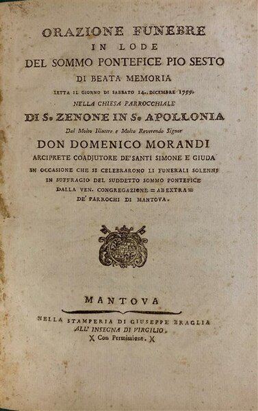 ORAZIONE FUNEBRE in lode del Sommo Pontefice Pio Sesto di beata memoria letta il giorno di sabato 14 Dicembre 1799 nella chiesa parrocchiale di S. Zenone in S. Apollonia. dalla Ven Congregazione -ab extra- de' parrochi di Mantova.