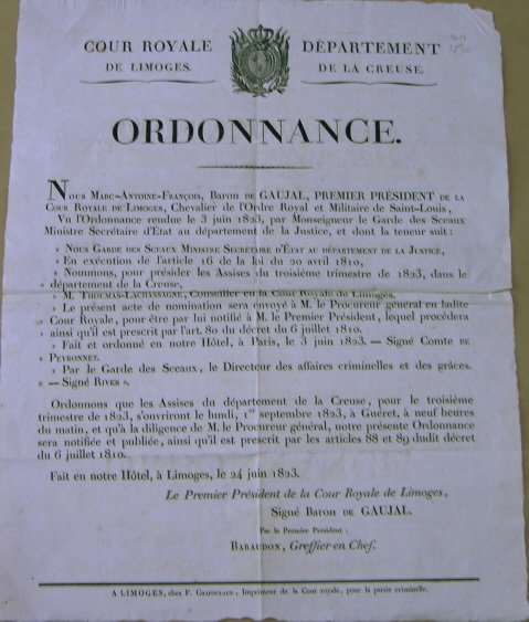 A Limoges, chez Chapoulaud, 1823. 53 x 42 cm. Nomination de Thoumas Lachassagne, Conseiller en la cour royale de Limoges pour présider aux Assises du 3è trimestre de 1823 dans le département de la Creuse.