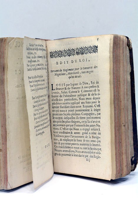 I: Ordonnance de Louis XIV Roi de France et de Navarre. Donnée à Saint Germain en Laye, au mois d'Avril 1667: 2 feuillets. 228 pages. II: Ordonnance de Louis XIV Roi de France et de Navarre: Ensemble les edits et declaratons touchant le reformation de la justice (Aout 1669) 114 pages.III: Ordonnance de Louis XIV Roi de France et de Navarre: pour les Matières criminelles Saint-Germain-en-Laye (Aout 1667) 126 pages. IV: Ordonnance de Louis XIV Roi de France et de Navarre: Servant de reglement pour le commerce des marchands donnéé à saint-Germain-en-Laye (avril 1673). 98 pages. (12,5x7,5 Cm). Plein veau de l'époque. Dos à nerfs. Manques angulaires sur les deux plats.Manque de cuir au dos. Taches et rousseurs. Recueil des ordonnances de Louis XIV. Elles présentent une profonde réforme et une nouvelle organisation du droit civil, criminel et commercial.