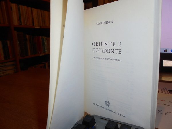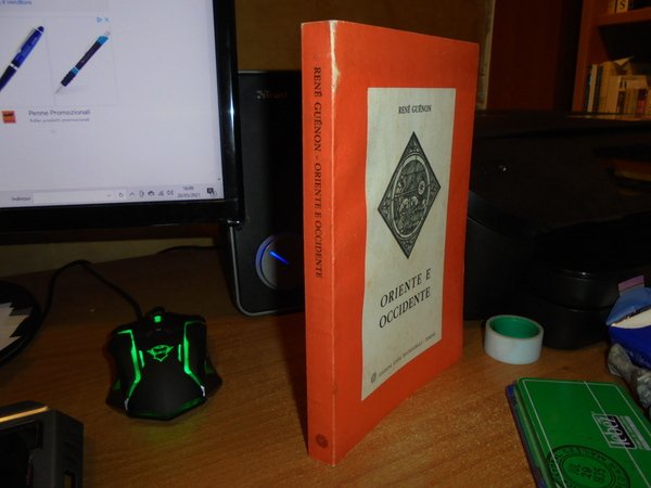 René Guénon. Torino, Edizioni Studi Tradizionali, 1965. ORIENTE E OCCIDENTE. In-8° , br. 256 pp. Lievi segni del tempo alle copertine ma ben conservato. Uff. stanzetta mob. piccolo destra