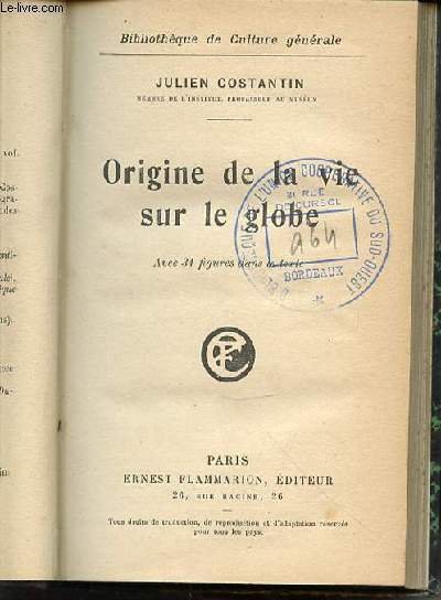 ORIGINE DE LA VIE SUR LE GLOBE - BIBLIOTHEQUE DE CULTURE GENERALE.
