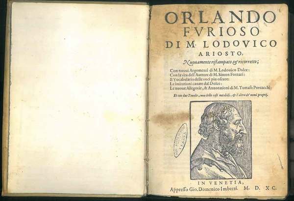 <p>21 cm, rilegatura in piena pergamena antica, titolo ben manoscritto al dorso, frontespizio col ritratto dell' Ariosto disegnato da Tiziano, (cfr. Agnelli-Ravegnani, Annali delle edizioni ariostee, v.1, p. 167). 46 canti, ciascuno preceduto dal proprio frontespizio in ricca cornice, una vignetta e l'argomento del canto in ottava rima di Lodovico Dolce e le allegorie di Tomaso Porcacci in cornice. Legato assieme 5 canti "Stanze del San Luigi Gonzaga e i cinque canti di M. Lodovico Ariosto con il bel ritratto dell' Ariosto al frontespizio e la stesssa tipologia (argomento, allegorie, incisioni) dell'Orlando. I canti sono preceduti dalla dedica al Mag. et honorato M. Pierto Martire Sandrini di Thomaso Porcacchi e dalla vita di Ariosto descritta da Simon Fornari.Testo su due colonne, capilettera e fregi silografici. Alone al margine superiore alle prime 100 carte, che non disturba la lettura del testo, forellino di tarlo a sei carte, Vecchio timbro privato al frontespizio, le vignette dei primi due canti ben colorate a mano. Lievi bruniture sparse. Esemplare completo e molto buono</p>