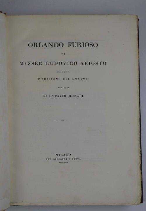 Cm. 32,5, pp. xxxvi, 547 (1). Con ritratto inciso in rame all'antiporta. Solida legatura di poco posteriore in piena pelle, dorso a nervi con titoli e fregi in oro, piatti inquadrati da filetti in oro. Entro custodia. Esemplare genuino e ben conservato. Cfr. Agnelli-Ravegnani (I, 219-220): "Magnifica e pregiatissima edizione, che la Crusca citò, e che il Gamba giustamente apprezzò come una delle migliori. In fatti, egli scrive: - Con mirabile diligenza si prestò il dotto uomo alla buona riuscita, e così si ha il Furioso interamente restituito alle native forme dategli dal suo autore. -. In una dotta prefazione il Morali passa in esame tutte le antiche stampe del Furioso. Inoltre ha arricchito l'edizione di esatte tavole, le quali, dando i confronti delle lezioni adottate con quelle delle stampe più famigerate, segnano le più notabili differenze grammaticali.Di questa ediz. esistono 50 esemplari in carta grande velina.". Cagnolati G. (Mostra di edizioni ariostesche, n 220) : "Splendida edizione. ritratto dell'A. inciso da F. Caporale.".
