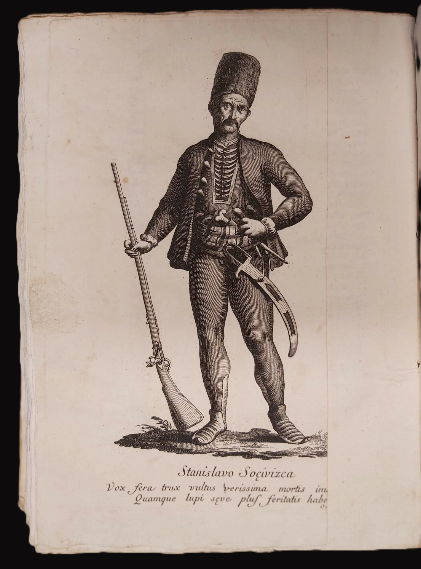 in-4, pp. 260, (4), leg. cartone color. edit. Con 2 tavv. ripiegate con la carta geografica del corso del fiume Cettina (da Dabar a Sign), e il ritratto del brigante croato Stanislav Socivica. Rara opera in ediz. orig. dello scienziato originario della Dalmazia veneta (Signo 1754-1777). Contiene molte riflessioni inerenti l'opera del Fortis suo collega, in particolare si focalizza sulla descrizione del popolo dei Morlacchi. Di questi sono ricordati usi e costumi, cibi, musica e danze, e supertstizioni: geni buoni e cattivi, folletti, vampiri, indemoniati, streghe, orchi, zapisi, apparizioni notturne. La seconda parte è dedicata all'avvincente biografia di Stanilav Socivica (Trebigne 1715-1777) contemporaneo all'A. e quindi da testimonianza diretta. Era questi un famoso brigante e assasino croato, ricordato per le sue feroci battaglie contro i Turchi Ottomani che assaliva e depredava lungo i territori di frontiera. Presso i popoli slavi era stimato come un eroe perchè combatteva i Turchi. Catturato fu costretto a convertirsi all'Islam, ma alla fine del Settecento, riparando in territorio asburgico, fu riconosciuto come valoroso combattente da Giuseppe II. Rara opera registrata su Iccu in sole due biblioteche italiane (Pordenone e Trieste). Picc. strappo riparato al margine bianco di pag. 123 senza lesioni al testo. Belliss. esempl. in barbe su carta forte. [550]