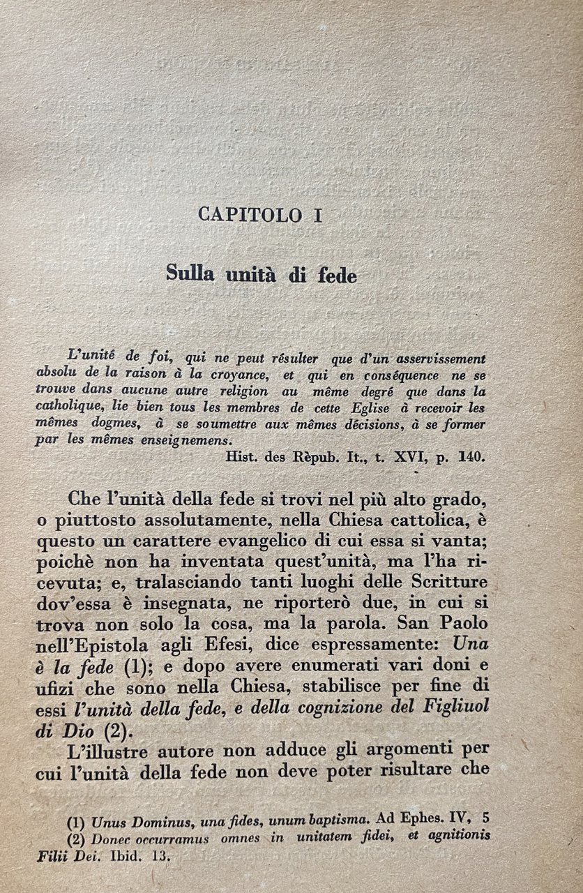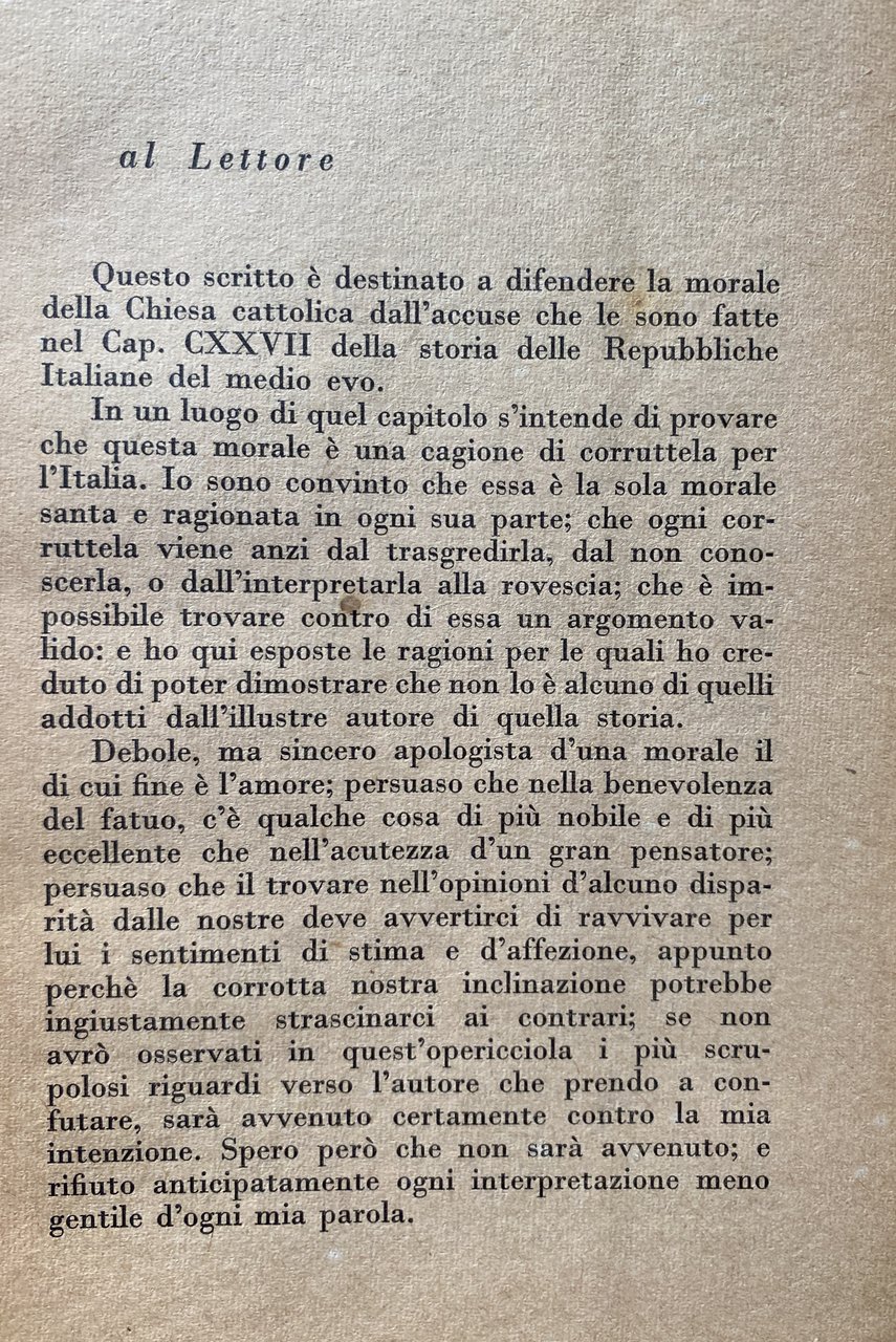Questo scritto è destinato a difendere la morale della Chiesa cattolica dall'accuse che le sono fatte nel Cap. CXXVII della storia delle Repubbliche Italiane del medioevo. In un luogo di quel capitolo s'intende di provare che questa morale è una cagione di corruttela per l'Italia. Io sono convinto che essa è la sola morale santa e ragionata in ogni sua parte; che ogni corruttela viene anzi dal trasgredirla, dal non conoscerla, o dall'interpretarla alla rovescia; che è impossibile trovare contro di essa un argomento valido: ho qui esposte le ragioni per le quali ho e creduto di poter dimostrare che non lo è alcuno di quelli addotti dall'illustre autore di quella storia. Debole, ma sincero apologista d'una morale il di cui fine è l'amore; persuaso che nella benevolenza del fatuo, c'è qualche cosa di più nobile e di più eccellente che nell'acutezza d'un gran pensatore; persuaso che il trovare nell'opinioni d'alcuno disparità dalle nostre deve avvertirci di ravvivare per lui i sentimenti di stima e d'affezione, appunto perchè la corrotta nostra inclinazione potrebbe ingiustamente strascinarci ai contrari; se non avrò osservati in quest'opericciola i più scrupolosi riguardi verso l'autore che prendo a confutare, sarà avvenuto certamente contro la mia intenzione. Spero però che non sarà avvenuto; e rifiuto anticipatamente ogni interpretazione meno gentile d'ogni mia parola.