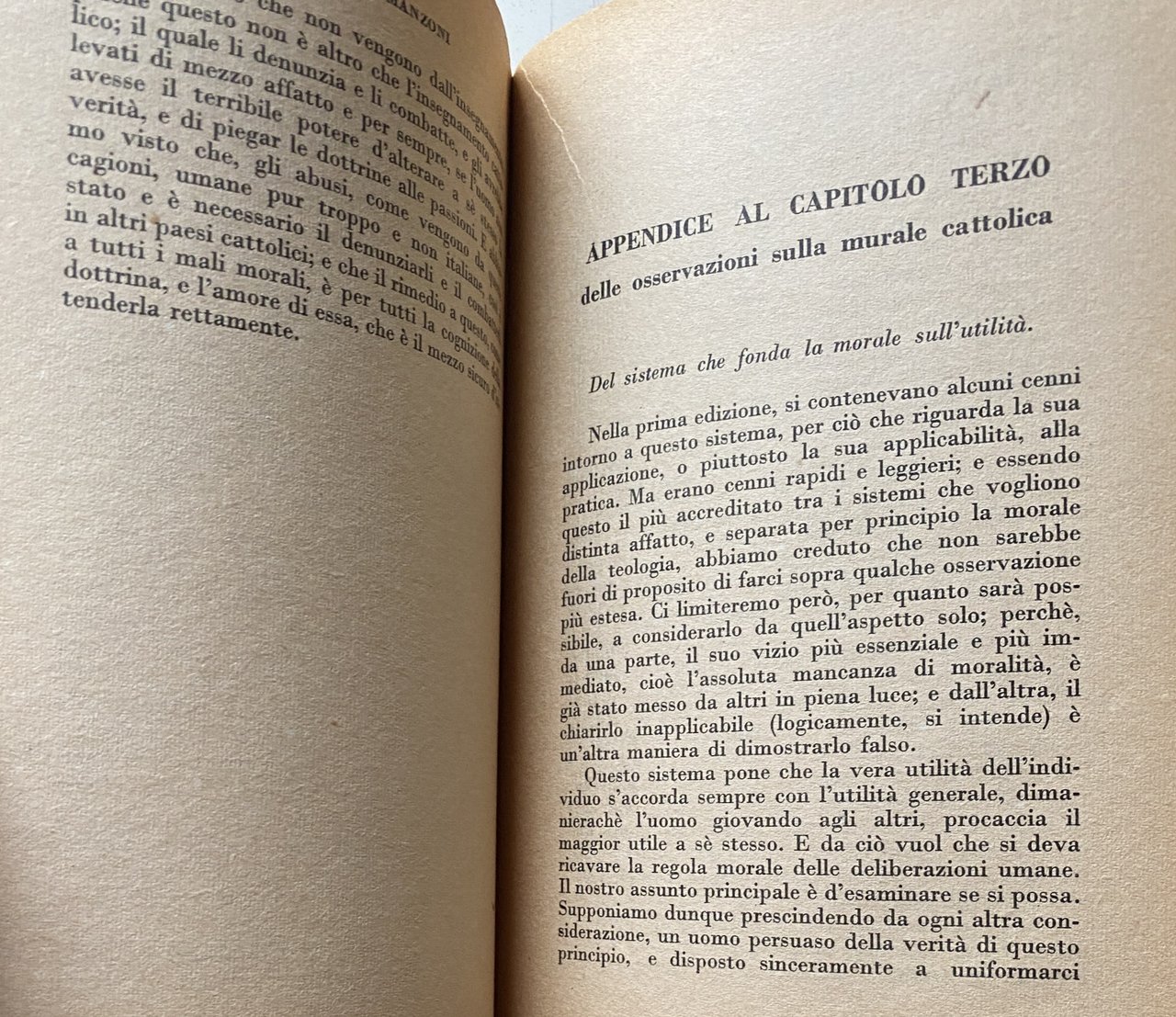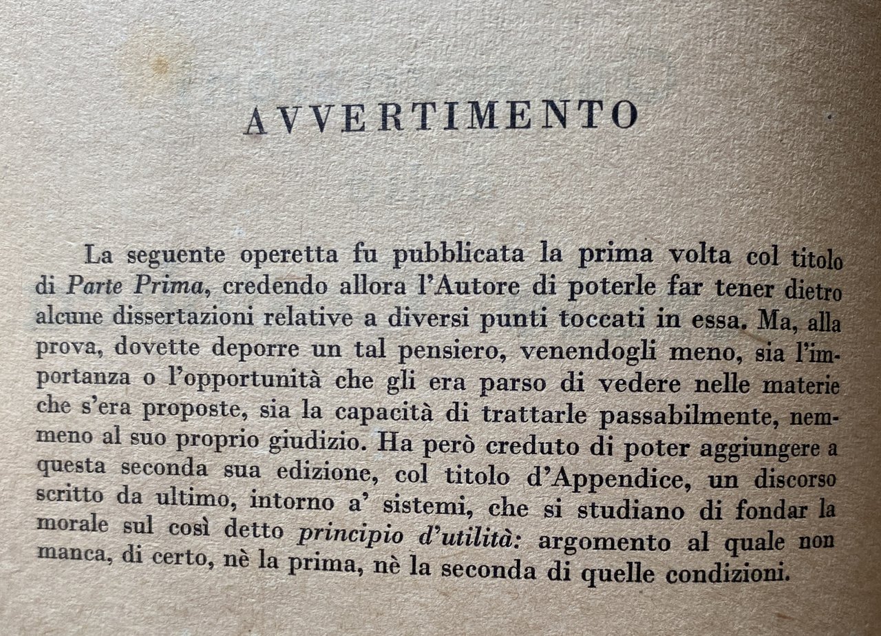La seguente operetta fu pubblicata la prima volta col titolo di Parte Prima, credendo allora l'Autore di poterle far tener dietro alcune dissertazioni relative a diversi punti toccati in essa. Ma, alla prova, dovette deporre un tal pensiero, venendogli meno, sia l'importanza o l'opportunità che gli era parso di vedere nelle materie che s'era proposte, sia la capacità di trattarle passabilmente, nemmeno al suo proprio giudizio. Ha però creduto di poter aggiungere a questa seconda sua edizione, col titolo d'Appendice, un discorso scritto da ultimo, intorno a' sistemi, che si studiano di fondar la morale sul così detto principio d'utilità: argomento al quale non manca, di certo, nè la prima, nè la seconda di quelle condizioni.