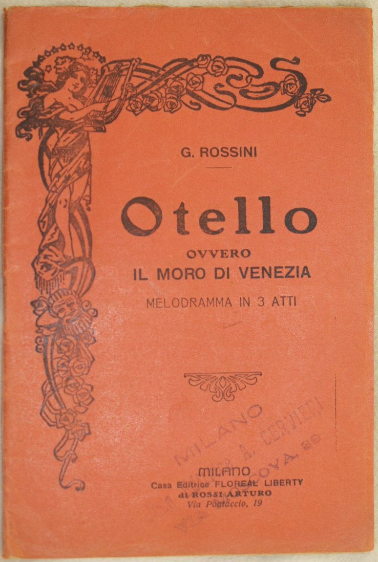 In 8. Dim. 19x12,5 cm. Pp. 30. Bel libretto d'opera del 1920 circa dell'opera in tre atti "Otello" di Gioachino Rossini (1792-1868). La prima rappresentazione ebbe luogo al Teatro del Fondo di Napoli il 4 dicembre 1816. In buone condizioni. Bella brossura editoriale illustrata. Brossura editoriale in buone condizioni generali con lievi usure ai margini e dorso. Legatura in buone condizioni. All'interno le pagine si presentano in ottime condizioni con rare fioriture.Beautiful booklet of 1920's circa of the work in three acts "Otello" by Gioachino Rossini (1792-1868). The first representation took place in the Teatro del Fondo in Naples the 4th of december 1816. In good conditions. Illustrated editorial cover in liberty style. Editorial cover in good general conditions slightly worn in the edges and spine. Binding in good conditions. Inside pages are in very good conditions with occasional foxings.