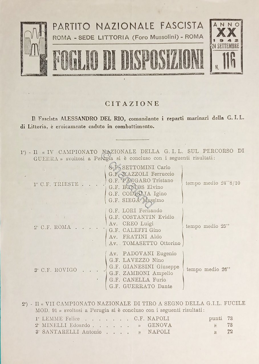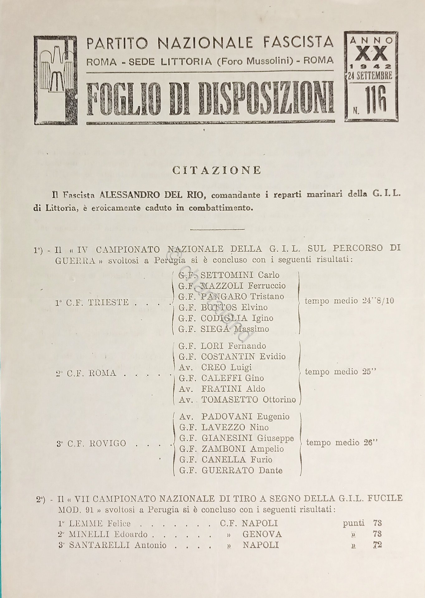 P.N.F. Roma - Foglio di Disposizioni N. 116 - Eroicamente caduto A. Del Rio 1942