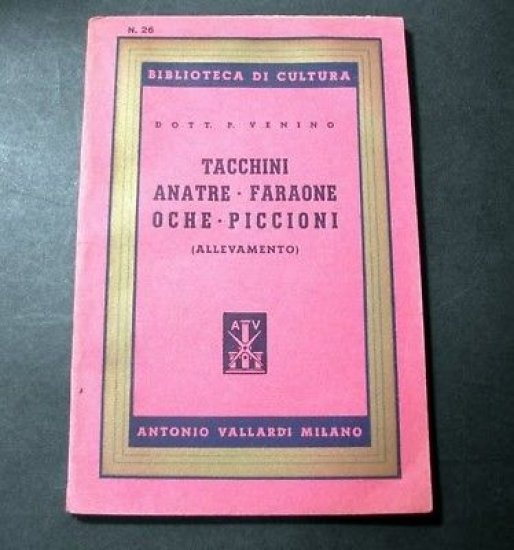 *** P. Venino - Tacchini anatre faraone oche piccioni allevamento - 1^ ed. 1946 - pp. 112. Bella pubblicazione, fonte ricchissima di informazioni per studiosi, appassionati e collezionisti