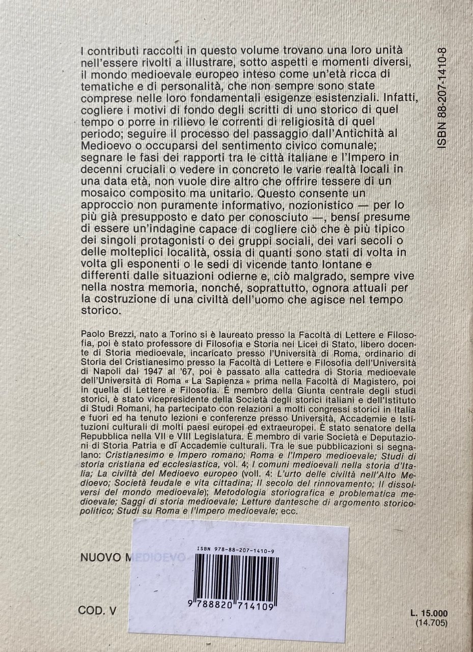 I contributi raccolti in questo volume trovano una loro unità nell'essere rivolti a illustrare, sotto aspetti e momenti diversi, il mondo medioevale europeo inteso come un'età ricca di tematiche e di personalità, che non sempre sono state comprese nelle loro fondamentali esigenze esistenziali. Infatti, cogliere i motivi di fondo degli scritti di uno storico di quel tempo o porre in rilievo le correnti di religiosità di quel periodo; seguire il processo del passaggio dall'Antichità al Medioevo o occuparsi del sentimento civico comunale; segnare le fasi dei rapporti tra le città italiane e l'Impero in decenni cruciali o vedere in concreto le varie realtà locali in una data età, non vuole dire altro che offrire tessere di un mosaico composito ma unitario. Questo consente un approccio non puramente informativo, nozionistico più già presupposto e dato per conosciuto bensì presume di essere un'indagine capace di cogliere ciò che è più tipico per lo dei singoli protagonisti o dei gruppi sociali, dei vari secoli o delle molteplici località, ossia di quanti sono stati di volta in volta gli esponenti o le sedi di vicende tanto lontane e differenti dalle situazioni odierne e, ciò malgrado, sempre vive nella nostra memoria, nonché, soprattutto, ognora attuali per la costruzione di una civiltà dell'uomo che agisce nel tempo storico.