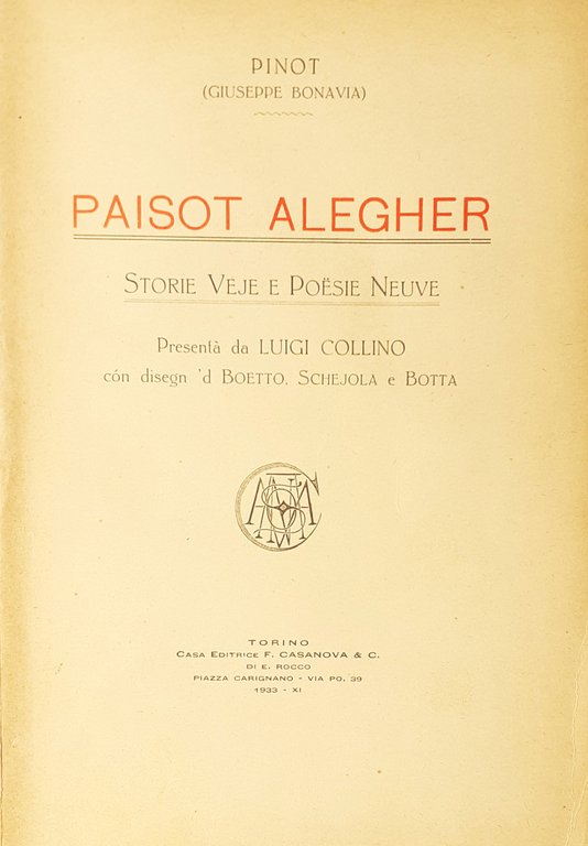 I ed. In-16, pp. 144, bross. Presentazione in italiano di Luigi Collino, i racconti e le poesie sono in dialetto piemontese. Tavole illustrate in b/n con disegni di Luigi Collino. Stato buono (scollatura del dorso ai margini superiore e inferiore)