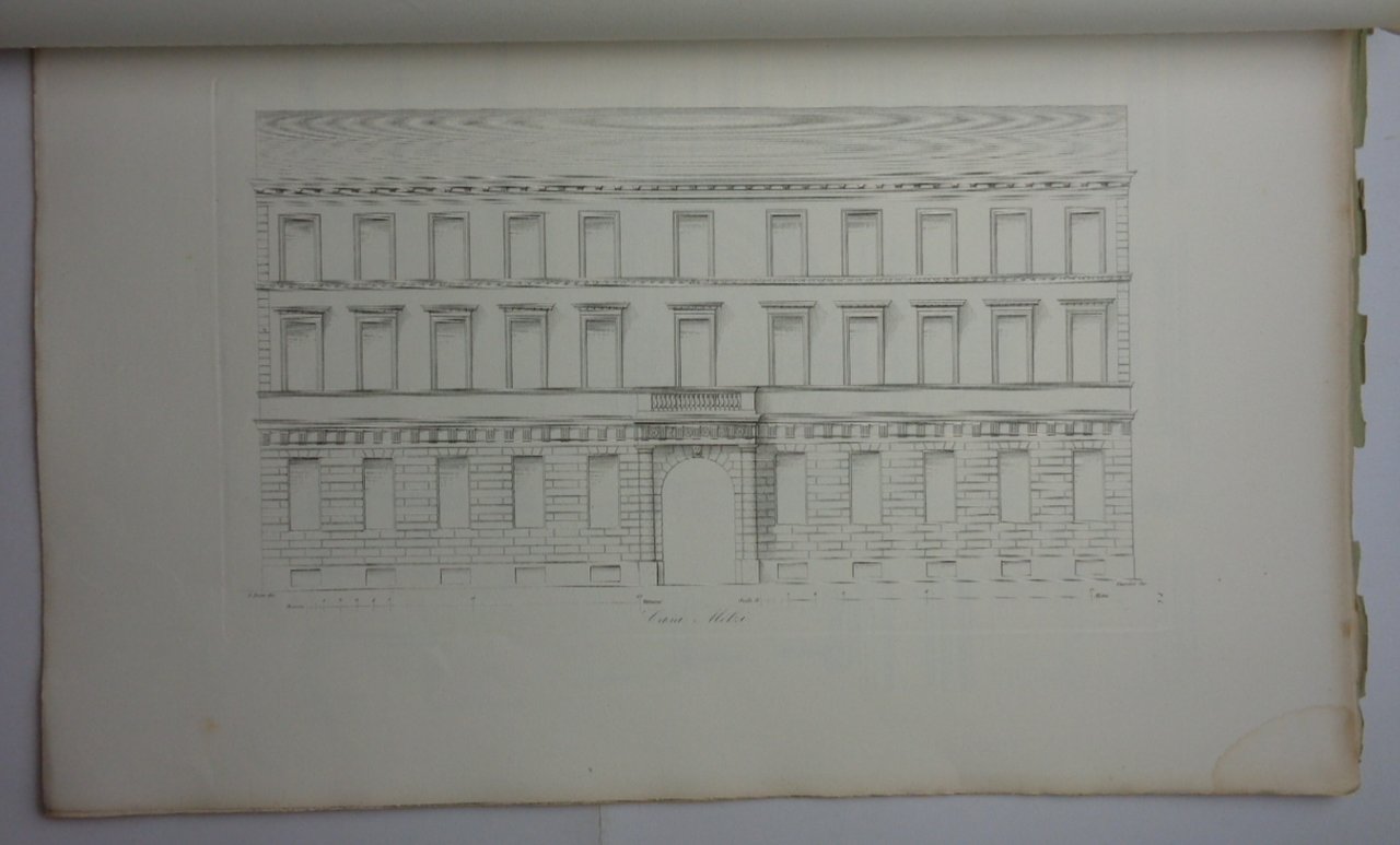 Nove tavole (40x58 cm) e due pp di introduzione in lingua francese, tratte dalla pubblicazione Italie Monumentale, collection des edifices les plus remarquables de Rome ancienne et de Milan (Deuxeème volume, IX). Palais Melzi: 1) Façade. Palais Taverna: 1) Portion du plan ed détails des ordres; 2) Façade; 3) Coupe sur la ligne AB. Palais Pensa: 1) Plams des deux étages du palais; 2) Façade et coupe; 3) Escalier tournant. Palais Tarsis: 1) Façade; 2) Détails d'ornements. Ottime condizioni. (Allegata la brossura cartacea originale della pubblicazione, con usure).