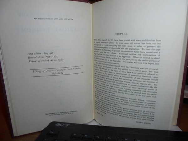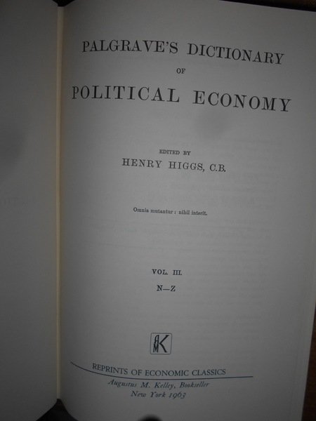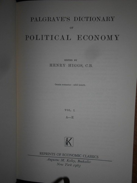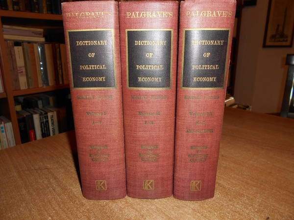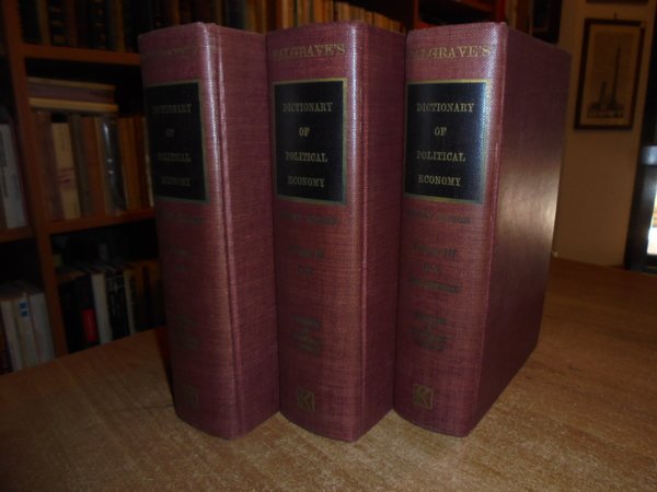 Henry Higgs, C.B. New York, Augustus M. Kelly, 1963. PALGRAVE'S DICTIONARY of POLITICAL ECONOMY. 3 volumi in-8°, tela con titoli ai dorsi. xvii, (1), 924 pp.; xviii, (1), 966 pp.; xxiii, 849 pp. con alcuni schemi nel testo. Ottimo esemplare. Uff. B - III - 4